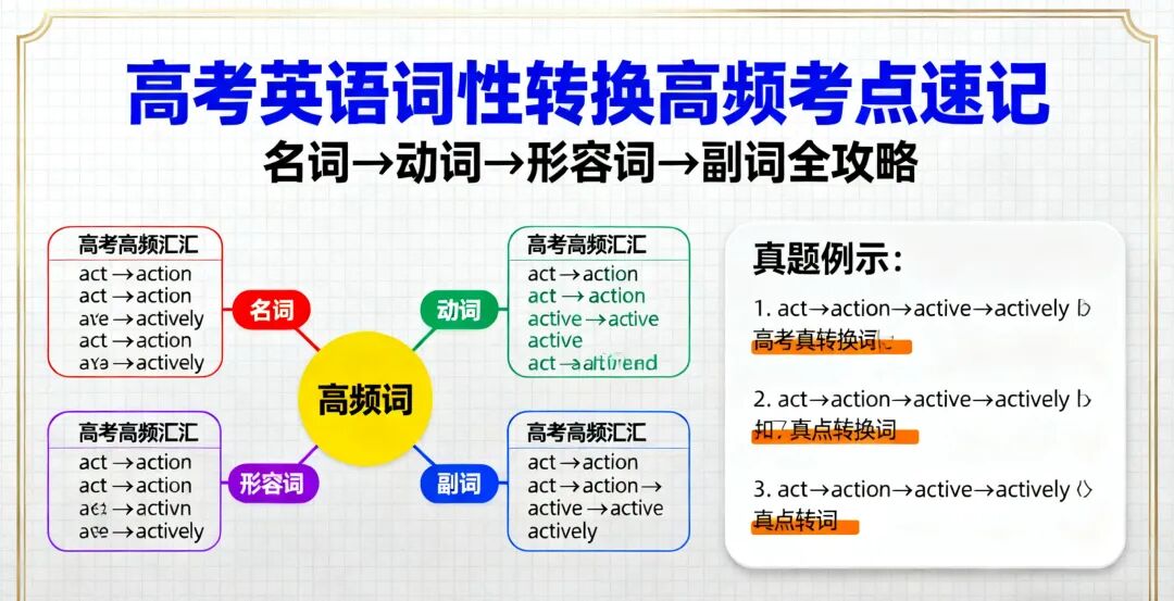 按高考考点出现频率+转换逻辑关联排序(非字母顺序),优先排列阅读、写作、语法填空核心考点,将同根词、易混词集中呈现,适配高考难度,助力高效记忆与区分。