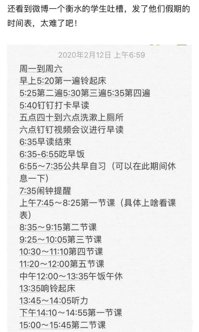 衡水中学校长的讲话给高三考生们注入了一阵强心剂,受疫情的影响,所有中小学都延迟开学,高三考生压力最大,之前就有专家预言今年的高考“考生水平可能会受影响”。而一直以来以升学率、高分人数而备受瞩目的“衡水”“毛坦厂”在疫情中是如何安排学生学习的呢?我们搜集到了衡水中学和毛坦厂中学的假期学习时间表,一起看看。