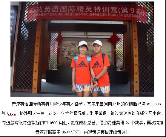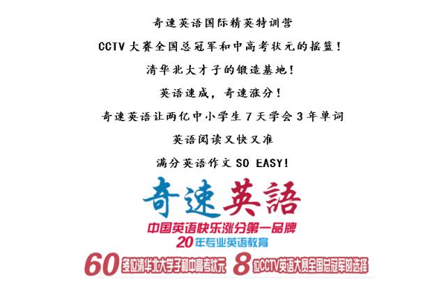奇速英语国际精英特训营(词汇营和阅读营)面向全国中小学生招生,求学、游学、励志教育三结合!特训营完全融合奇速英语教育理念:“兴趣+习惯+方法”和全国独家的专利课程,得到学生家长们一致好评。奇速英语第13期寒假冬令营报名热线18982092551(陈老师)