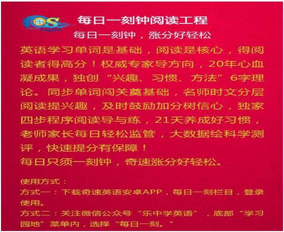 坚持每日使用“奇速英语每日一刻钟”,将1个月培养出良好的单词记忆和阅读练习的习惯;2个月完成1册教材同步英语单词记忆;4个月完成一年2册教材同步英语单词记忆;1年完成初中3年6册教材同步英语单词记忆;每日一篇时文阅读,锻炼阅读能力,提升英语成绩。