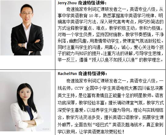 以蔡教授为首的奇速英语全国名师大联盟团队62位英语特级教师及1000多位高级教师紧密合作了10多年,已经成功出版了300多部精品图书和推出了系列独家课程。比如:有以《奇速英语24个故事48小时串记高中3500词汇》《奇速思维导图16次课速记初中1600单词》《奇速思维导图12次课速记小学800单词》为代表的《奇速英语单词速记法》;有初高中各年级奇速英语精品涨分班和中高考冲刺课程;有以《奇速英语快速阅读法》《奇速英语黄金语法口诀法》《奇速英语话题满分作文法》《奇速英语十个关键字完形满分法》为代表的奇速英语专项提分课程。在这些课程中,无一不体现出奇速英语的课程独特性和实战性。以奇速英语快速阅读课程为例,因为中高考都是在相同的时间内比速度和正确率,奇速英语快速阅读就强调“快”和“准”。老师会告诉你做阅读的一个总原则:所有的答案都必须忠实于原文,所有的答案都可以在原文中找到对应出处和依据。那么如何快速找到出处呢?用奇速“圈查选”三字诀,让你读得又快正确率又高。阅读完形作文占据中高考近100分分值,只要掌握了奇速英语学习方法,学生成绩会飞速提升。比如报奇速在线暑假班的王一飞同学,3个月时间英语成绩飞速上涨36分。