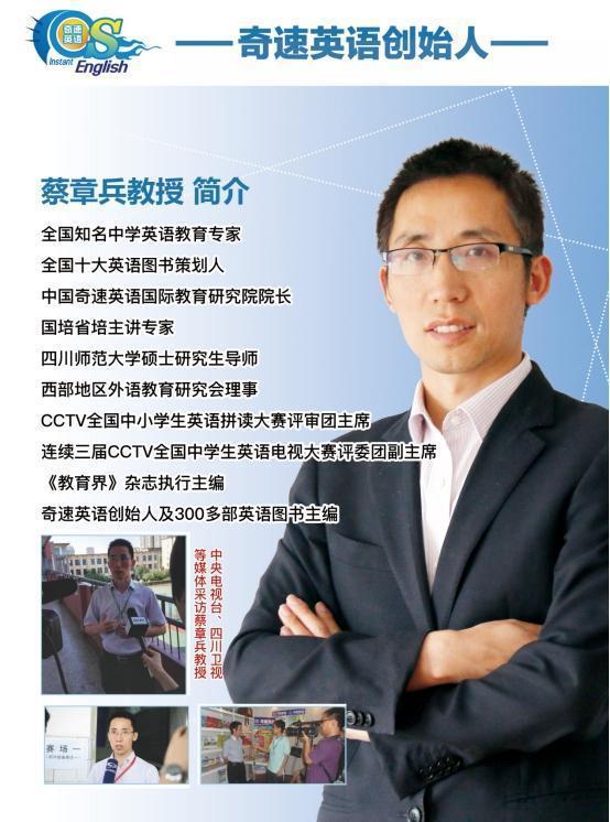 奇速英语创始人蔡章兵教授是著名英语教育专家,CCTV全国中小学生英语电视大赛总决赛评审团副主席,国家级、省级骨干教师培训专家,四川师范大学硕士生导师。蔡章兵教授专注中学英语教学二十余年,对快速突破英语词汇,快速提高英语阅读研究颇深,著作颇丰,采用最前沿的混合式个性化O2O教学模式(大数据+自适应+直播课+录播课+线下面授),构建英语“教研学测评练”完整生态教育圈,首创奇速英语词汇7步教学法,以奇速英语单词速记法(思维导图/故事速记单词)、快速阅读法、黄金语法口诀法、话题满分作文法、高效满分解题法等独特方法培养出了60多位北大清华才子和8位CCTV英语电视大赛全国总冠军。