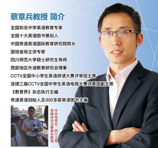 蔡章兵教授,奇速英语创始人,作为中学英语教育专家、硕士生导师、连续三年CCTV全国中小学生英语电视大赛评委团副主席、教育界杂志执行主编,已有出版英语图书300余本,专注中学英语教学二十余年,在英语教学和培训方面造诣匪浅,百度中个人信息高达二十多万条。国培 & 省培主讲专家,四川师大英语学科硕士生导师,高考新题型研讨会主讲专家,中国西部地区外语教育研究会理事,连续三届CCTV全国中小学生英语电视大赛评审团副主席,《教育界》杂志执行主编,奇速英语等300多部英语图书主编。蔡教授曾培养出了8位CCTV全国中小学生英语电视大赛总冠军,60多位北大清华高考状元。