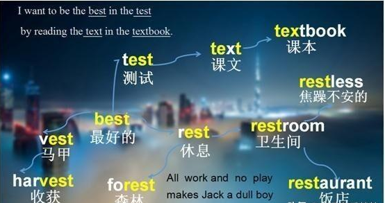 依次联想:(翻译:我想成为最好(best)的,所以我需要通过阅读课本(textbook)上的课文(text)在测试(test)中考得最好(best);我需要在饭店(restaurant)休息(rest),用一下洗手间(restroom),否则我会焦虑(restless);我脱下我最好的马甲(vest)在森林(forest)里面收获(harvest)橘子。这些句子连起来读是非常有节奏感的,同时也发现如果多读几遍,即可轻松记下所有单词,并且还能背下来。