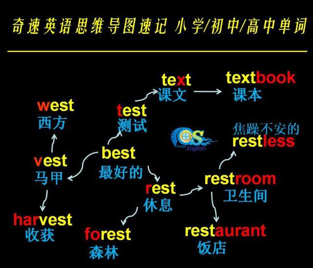 奇速英语是通过偏旁加部首,思维导图发散记忆。32小时速记:小学800词汇就100张思维导图,初中1600词汇204张思维导图,高中3500词汇300多张思维导图或采用一本小说24个故事连载串记3500词汇。每张思维导图,又编成一个故事。做到了词不离句,句不离篇,听说读写联动提升。学生提升的不仅仅是英语成绩,经过思维导图学习,今后对任何学科都会形成发散思维。今后进入职场工作,考虑问题也会比没经过思维导图训练的孩子更多角度,更加全面,这样的孩子今后更具有领导才能。