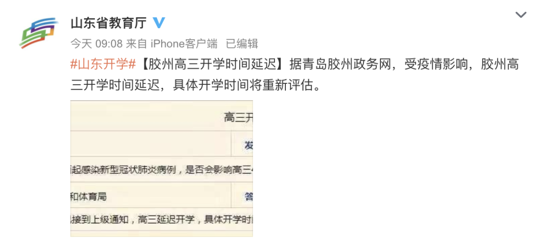 而根据最新消息,受疫情影响,山东胶州高三开学临时叫停,具体开学时间将重新评估。