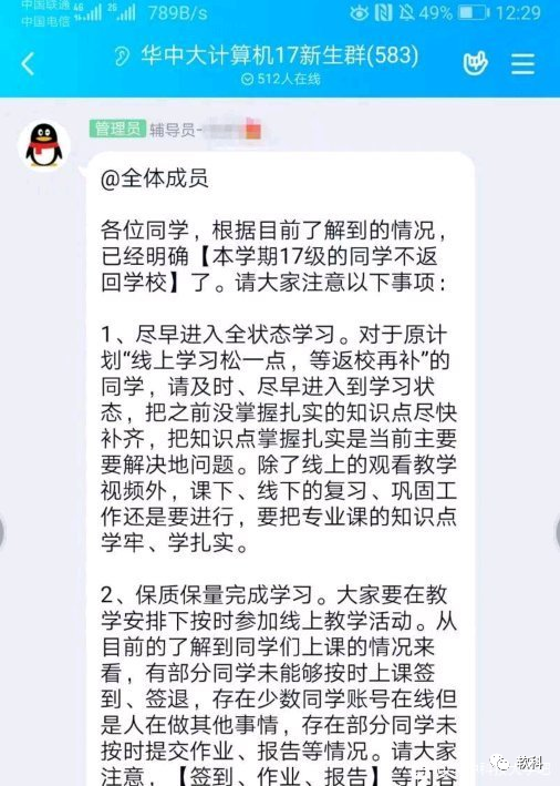 此外,华中科技大学贴吧也有同学提供了一则华科计算机学院新生群通知的截图,截图内容显示,“已经明确本学期17级的同学不返回学校”。