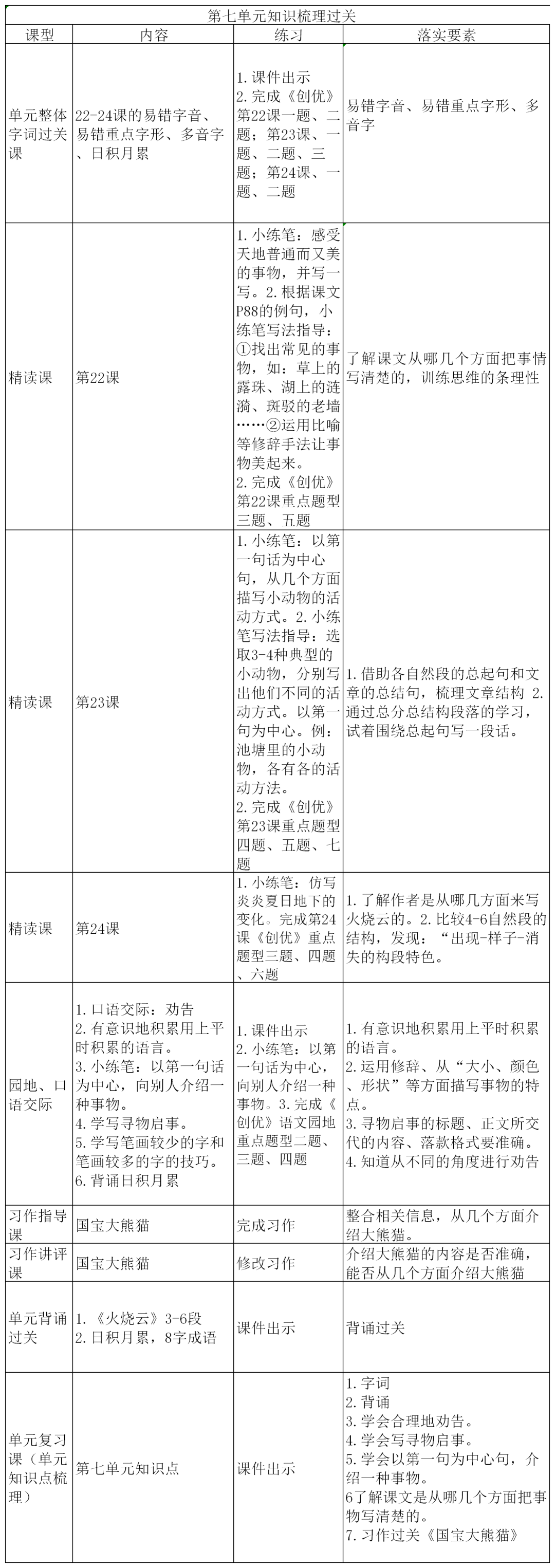 字词易错的归一类,精读课文的归一类,习作问题归一类。再用语文要素将这些散落的知识碎片串起来,构建成完整的知识体系。比如三年级下册第七单元: