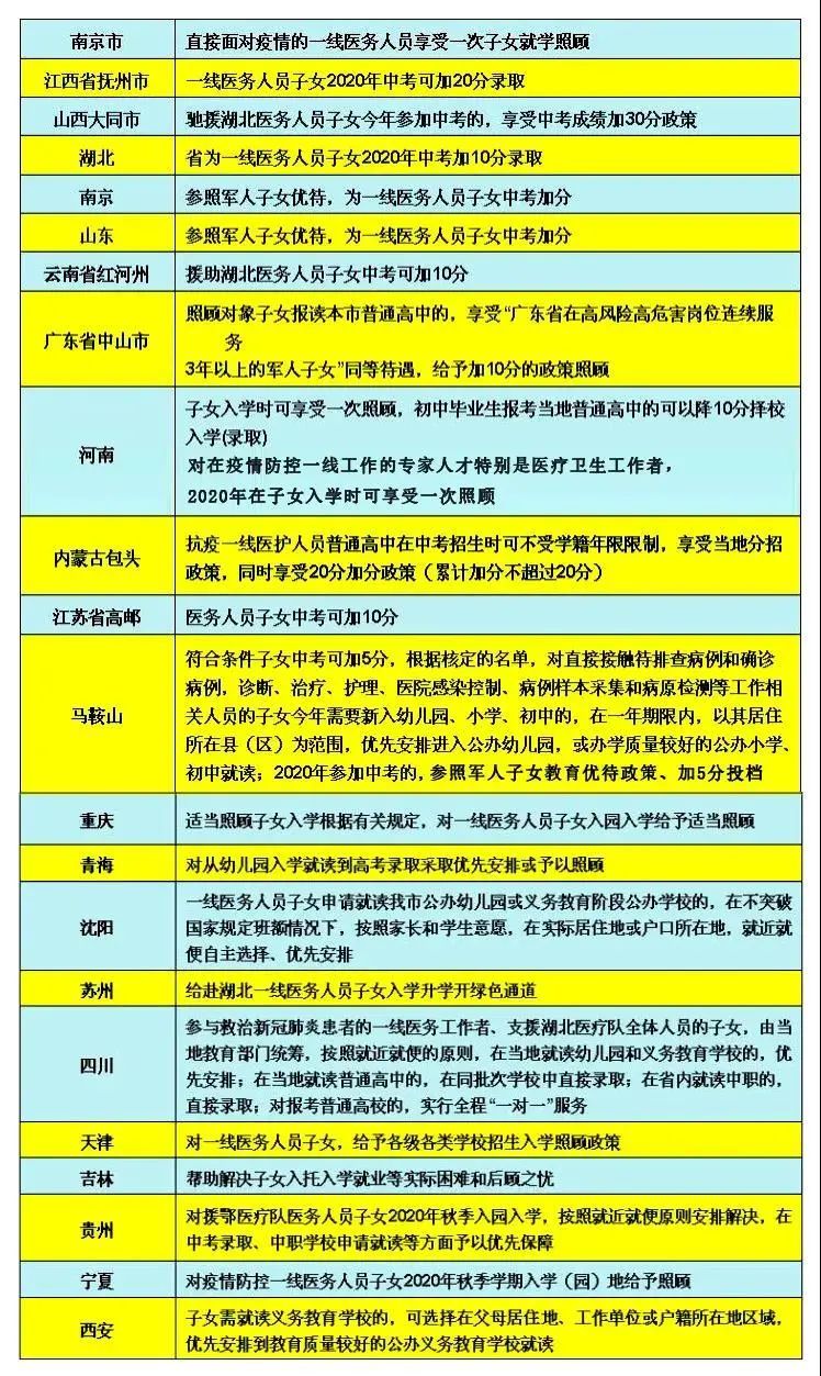 随着我国疫情防控形势向好,多地都出台了对于抗疫一线医护子女的中高考优抚政策,在2020中高考中,可对其子女采取加分或优先录取的政策。