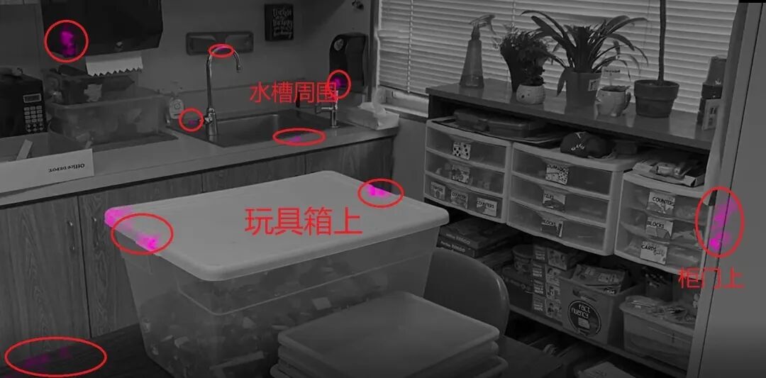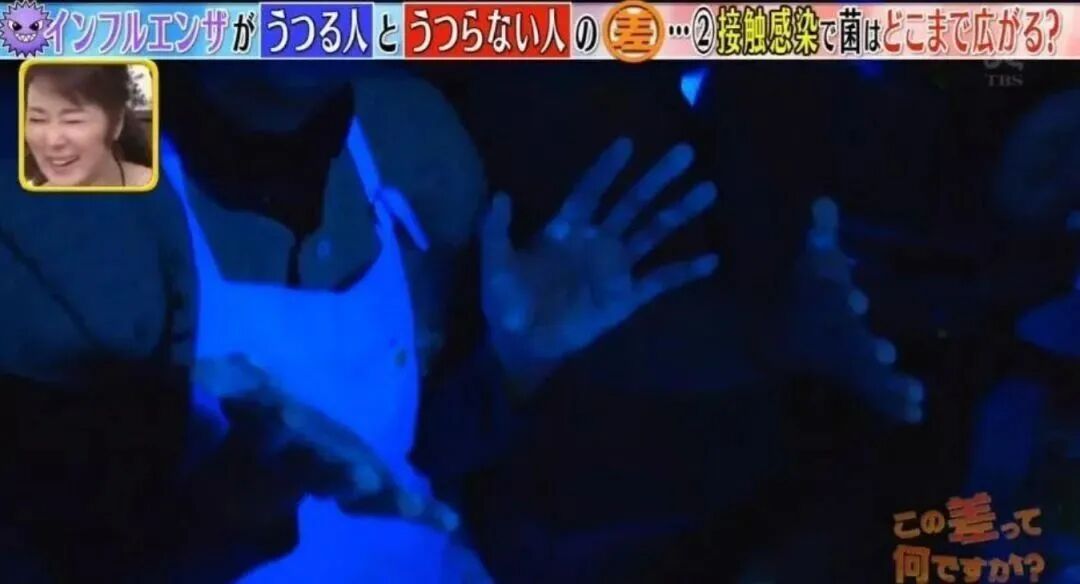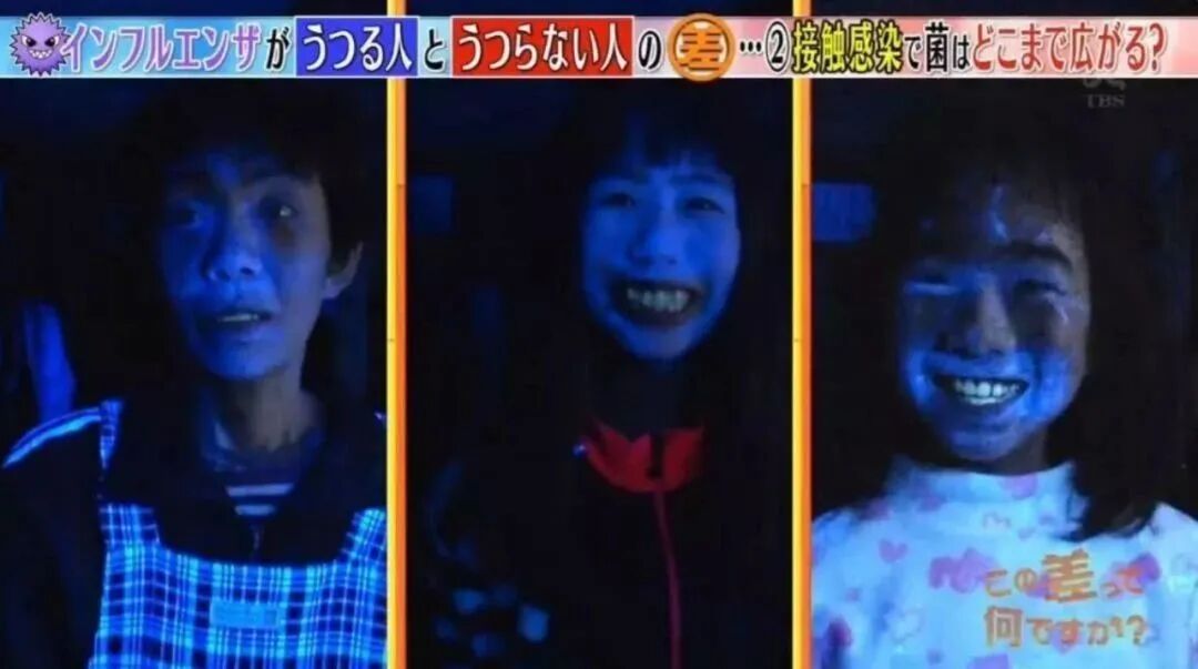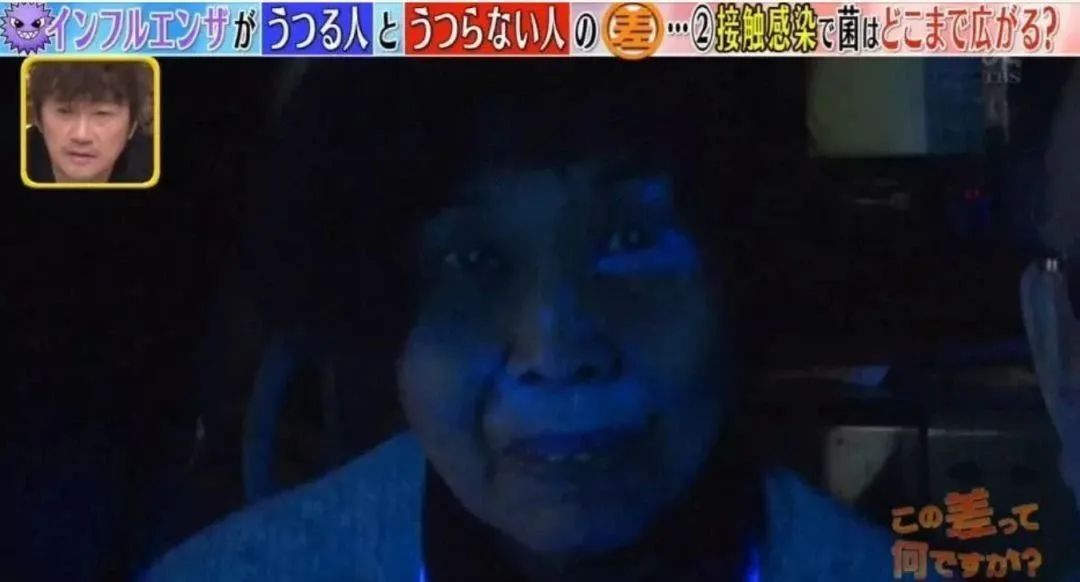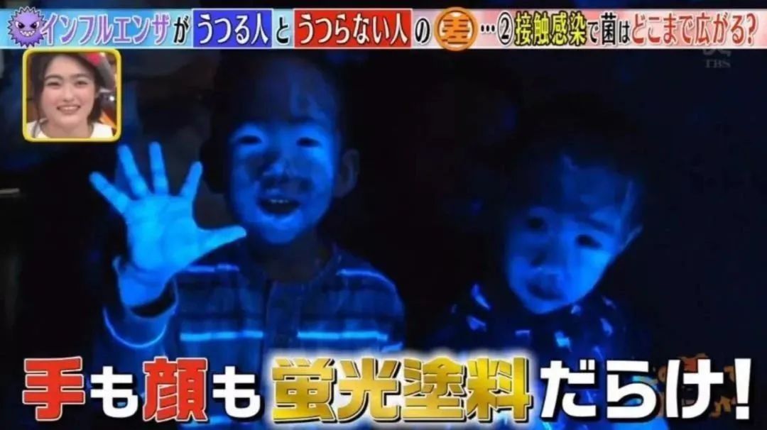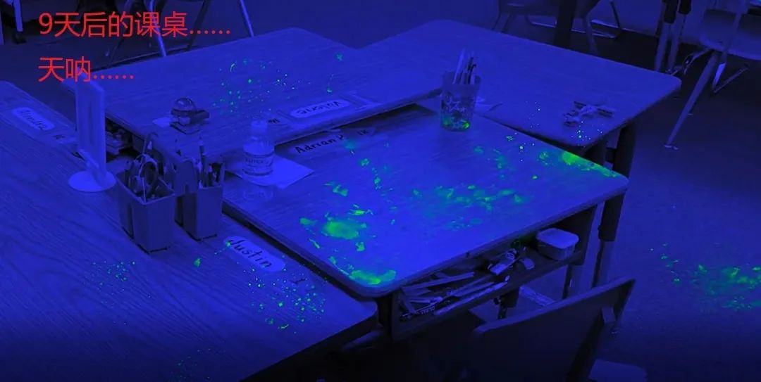 两小时后在紫外线照射下的两个小朋友,手上脸上全都是病毒!
