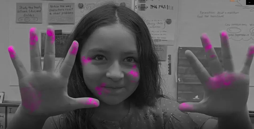 Rober解释道,细菌在这样的表面可以存活9个小时。即使学生们在一天之内洗了很多次手,但他们的脸上和手上都沾满了“细菌”。