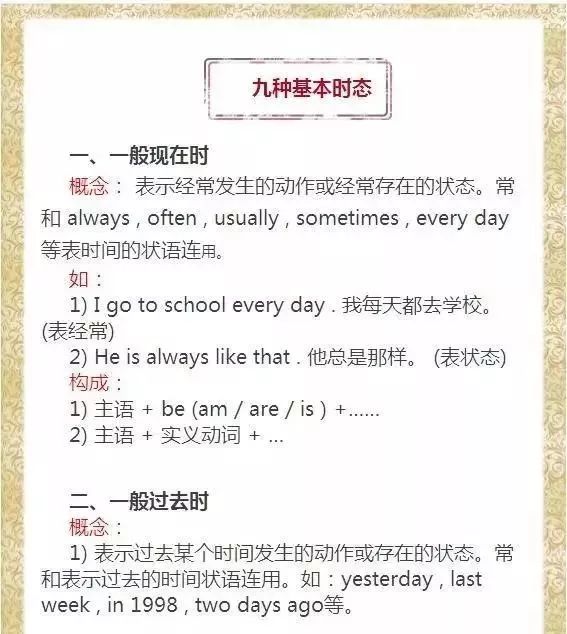 英语语法一直都是初中英语学习的重点和难点,我们都知道一个学习英语的规律,语法知识掌握得越好,英语成绩就会越好。今天小简老师给大家整理了初中英语语法的9大时态、3大从句、20个核心句型,这些知识都最实用的重要考点,希望对同学们的英语学习有所帮助!