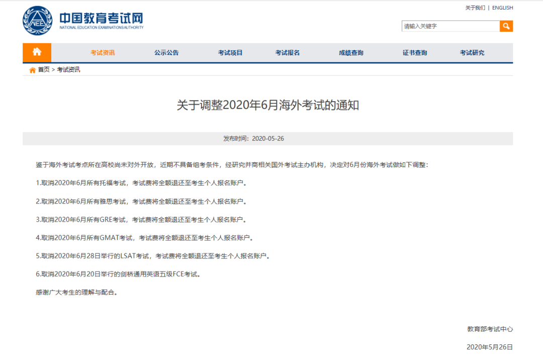 5月26日,中国教育考试网发布关于调整2020年6月海外考试的通知,决定取消今年6月托福、雅思、GRE等海外考试。这是教育部考试中心连续第二个月取消海外考试。