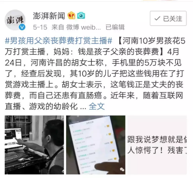 上海一位10岁的孩子,仅仅是为了想在网络主播面前炫耀自己,就轻易地把刚过世父亲的5万丧葬费打赏了主播。