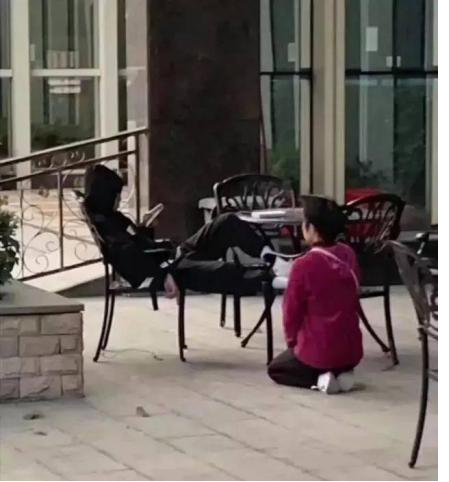 为了劝任性的孩子去上学,一位妈妈直直地跪在孩子面前,而孩子却坐在椅子上,翘着脚,悠闲地玩着手机,丝毫不把母亲这一副模样放在眼里。