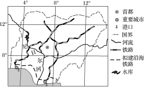 尼日利亚人口超过1亿,经济以农矿业为主。2014年11月20日,尼日利亚与我国正式签署了沿海铁路项目商务合同。该项目总金额达119.7亿美元,全线采用中国铁路技术标准,是截至当时中国对外工程承包史上单体合同金额最大的项目。下图示意尼日利亚铁路的分布。