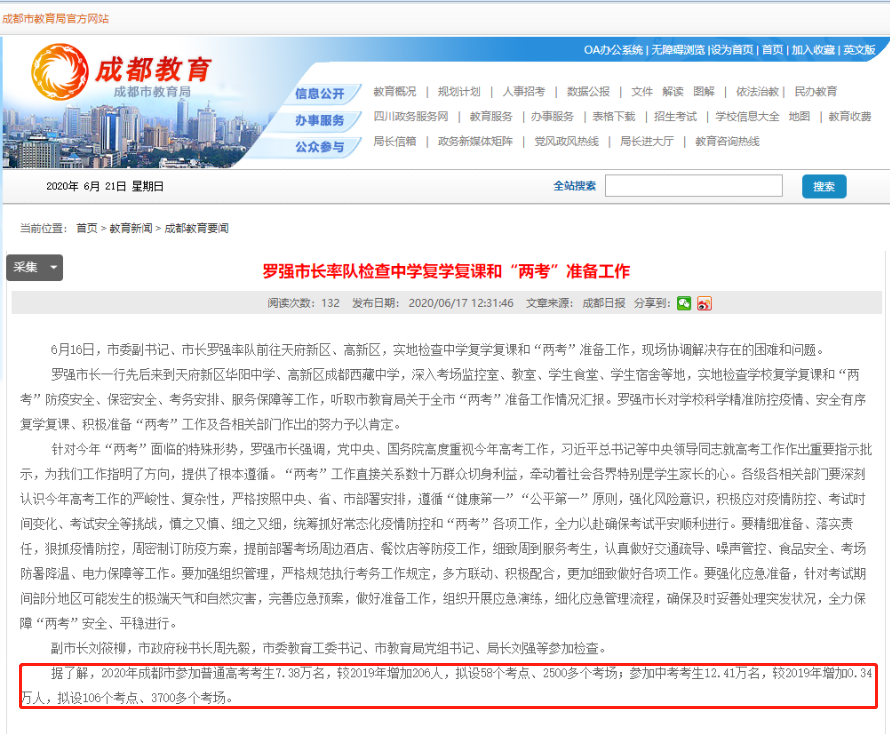 6月18日,成都市教育局通过官方网站公布了今年成都中考考生、考点等相关数据: