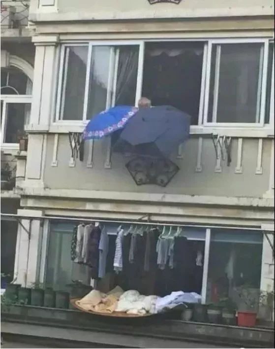 一场大雨突降宁波。见楼下的住户衣服还未收,楼上的大爷费力地探出身去为其撑好伞,他一直保持着这个姿势,直到到邻居把衣物收走。