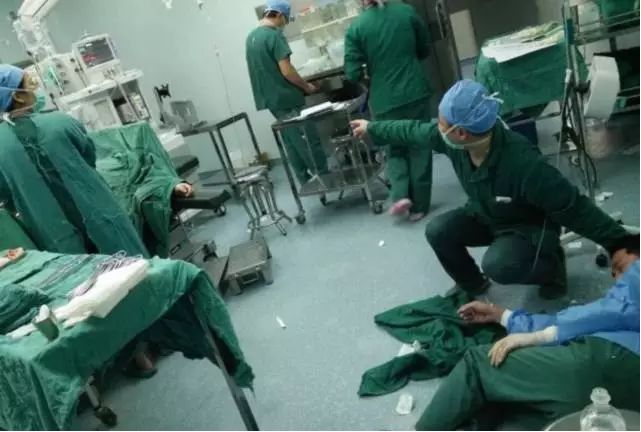 手术室里,一天连做7台手术的医生,刚放下手术刀就因体力不支,晕倒在地。