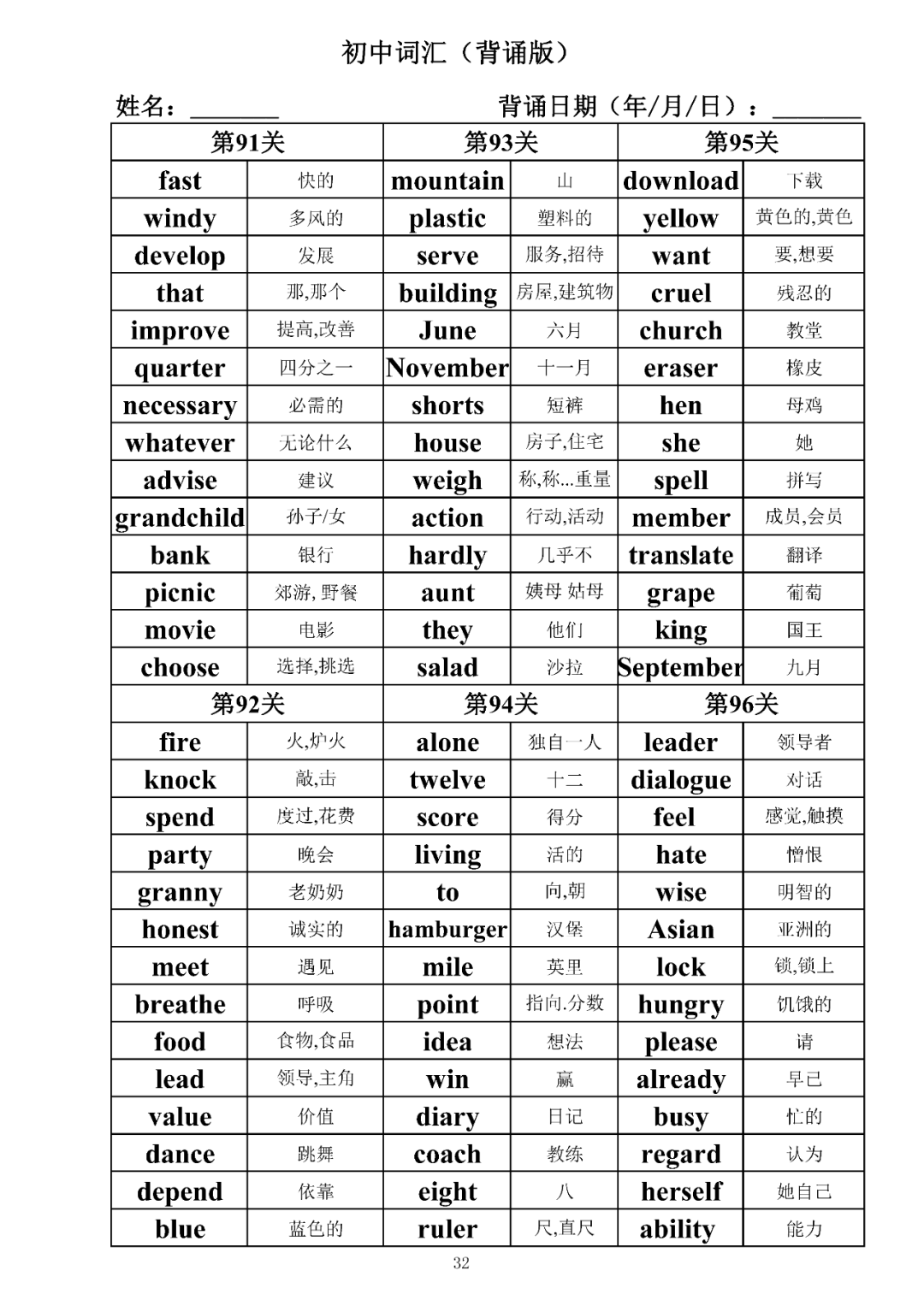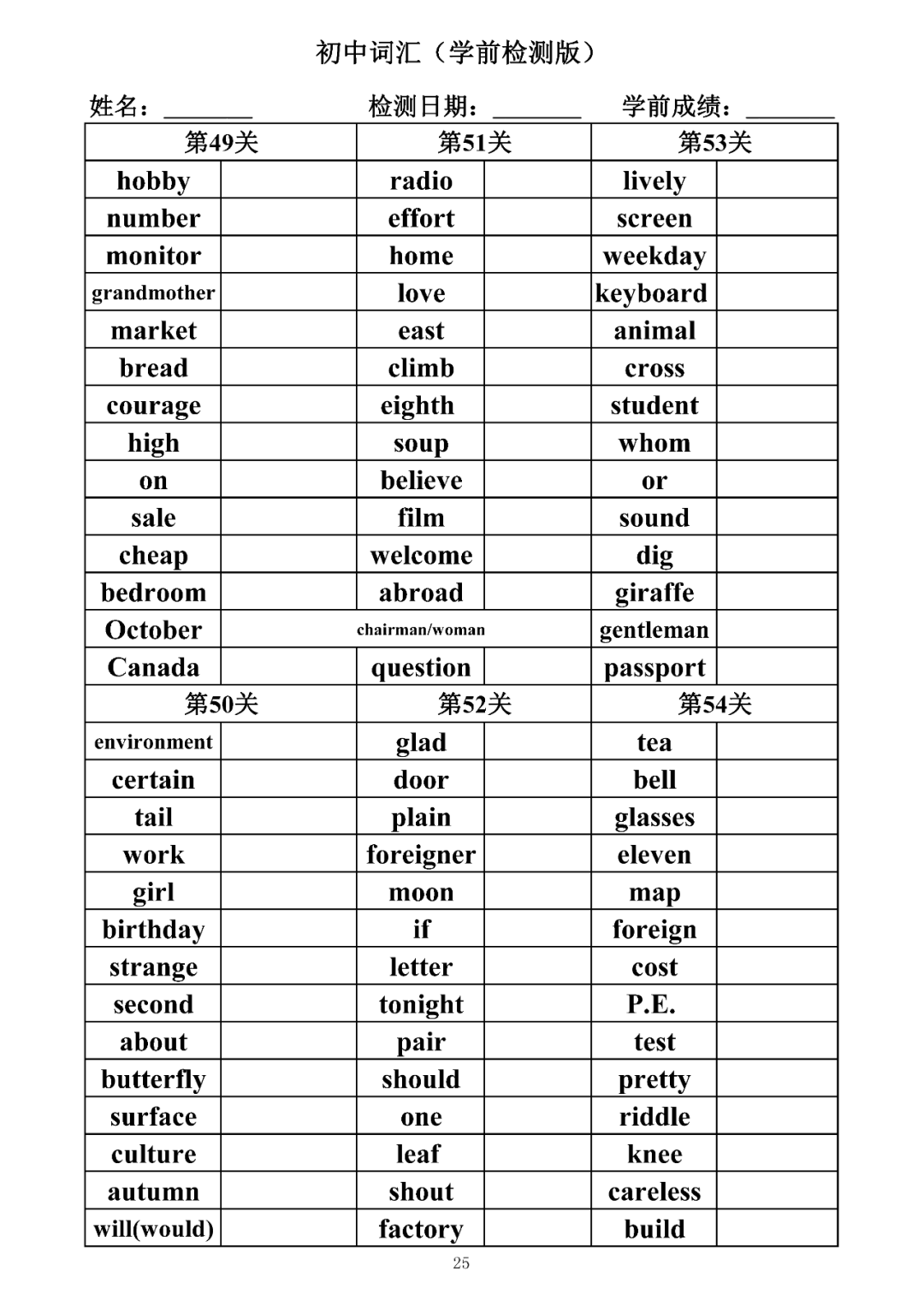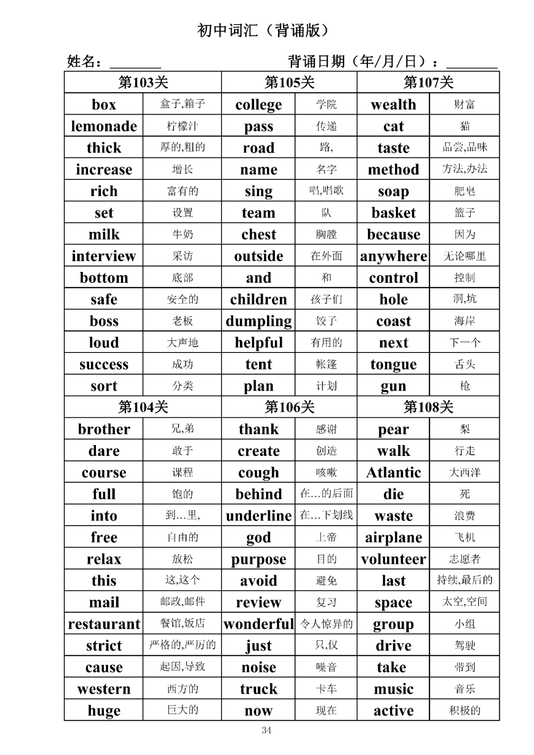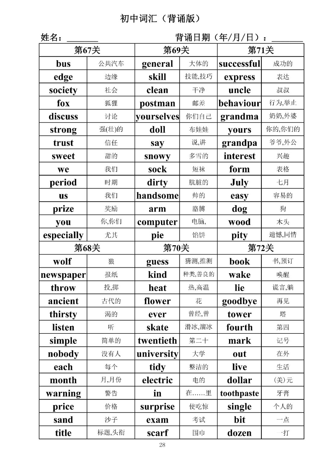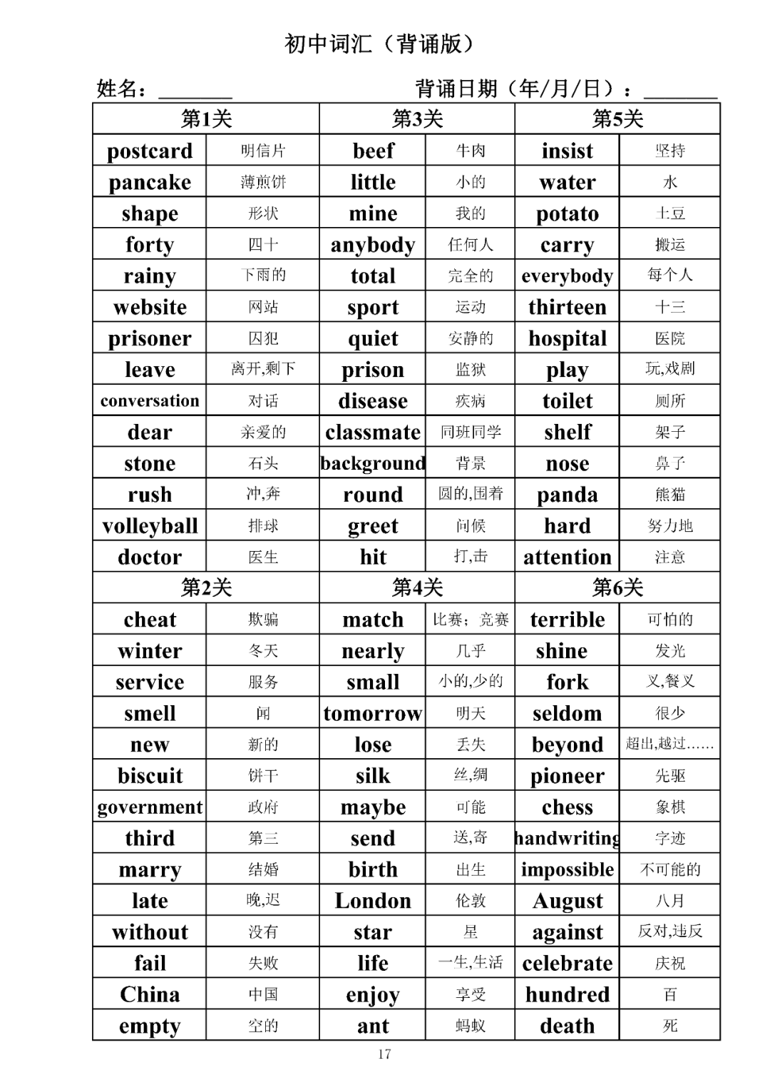 初中英语词汇(背诵版+检测默写版),打印出来直接用!