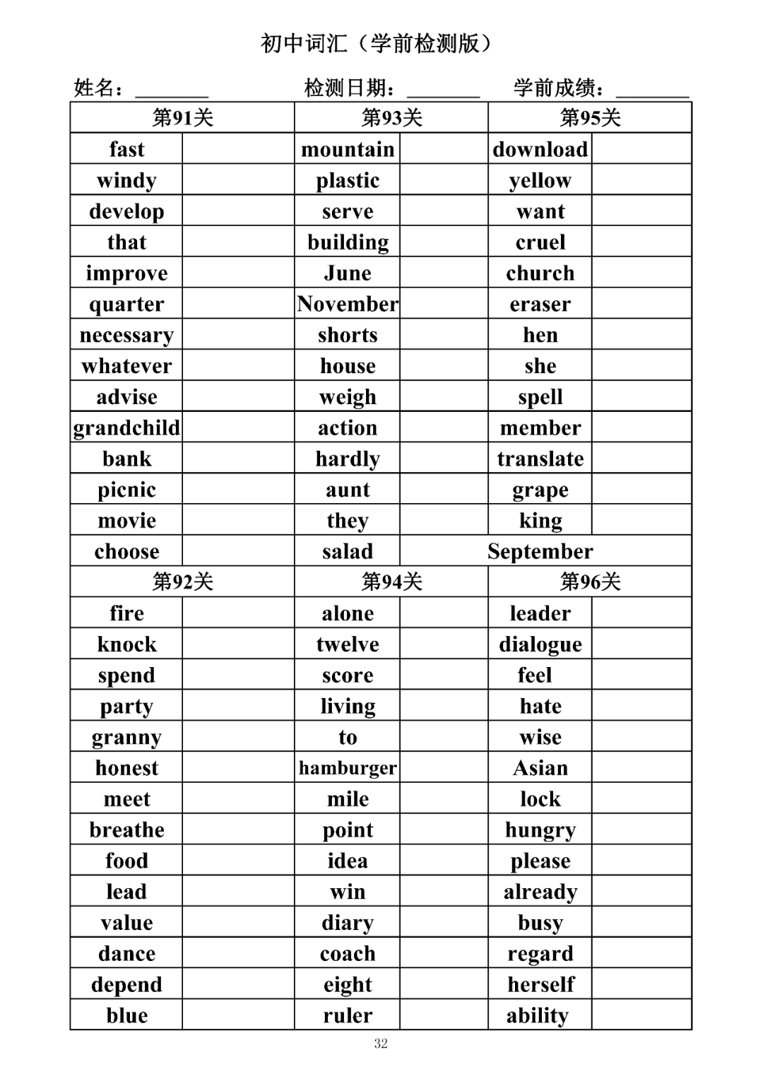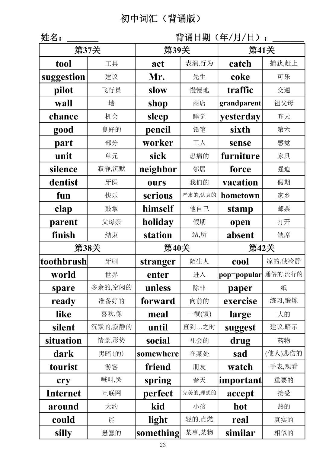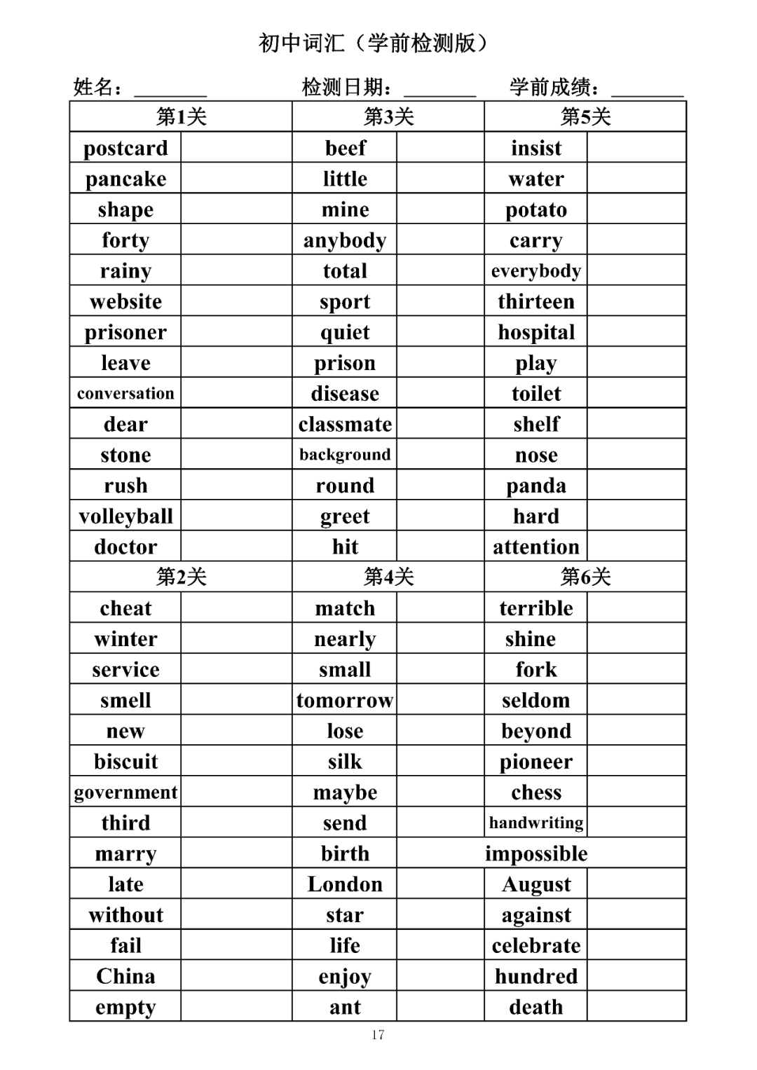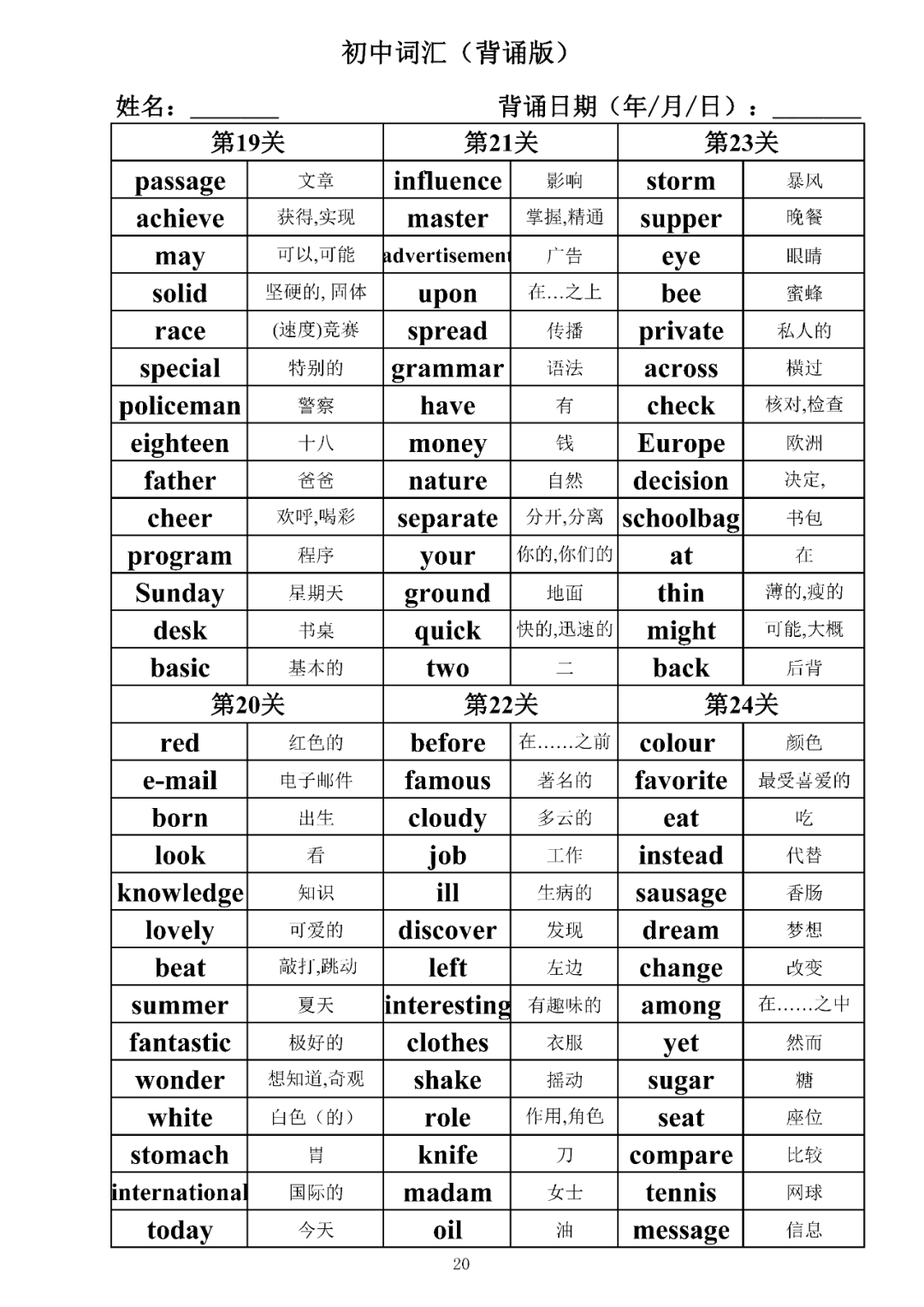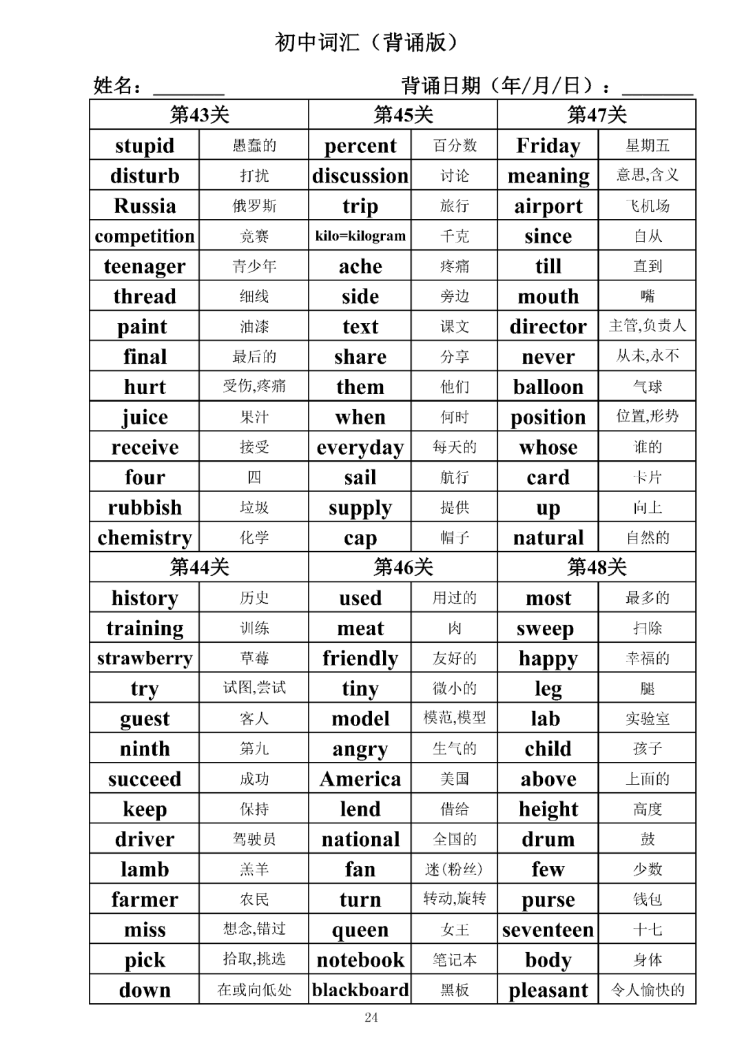 初中英语词汇(背诵版+检测默写版),打印出来直接用!