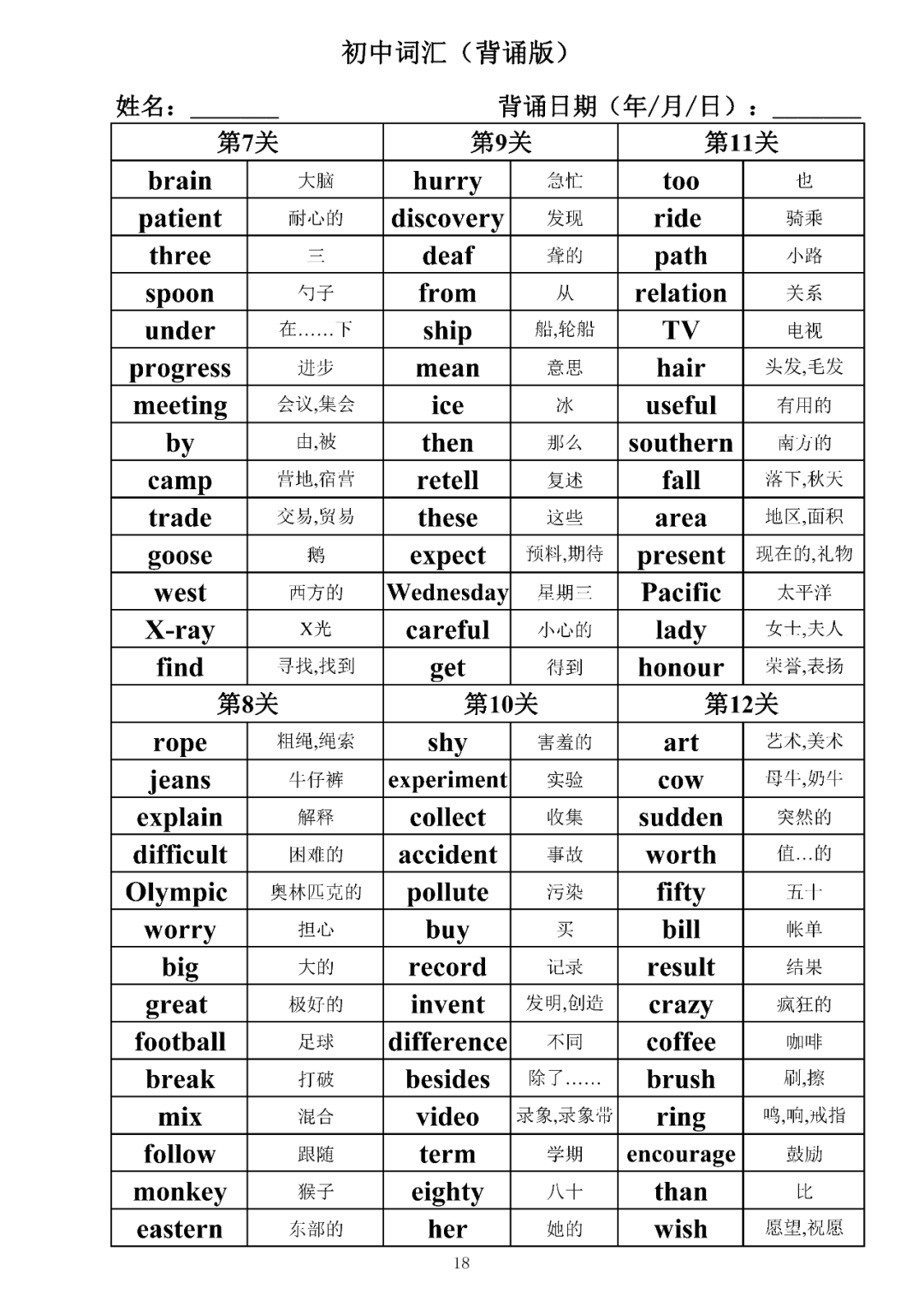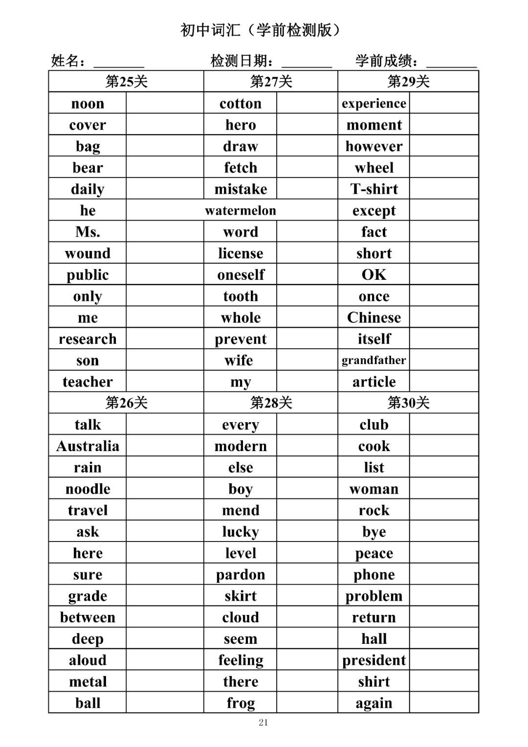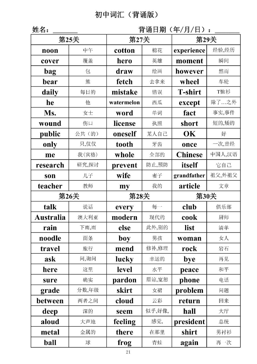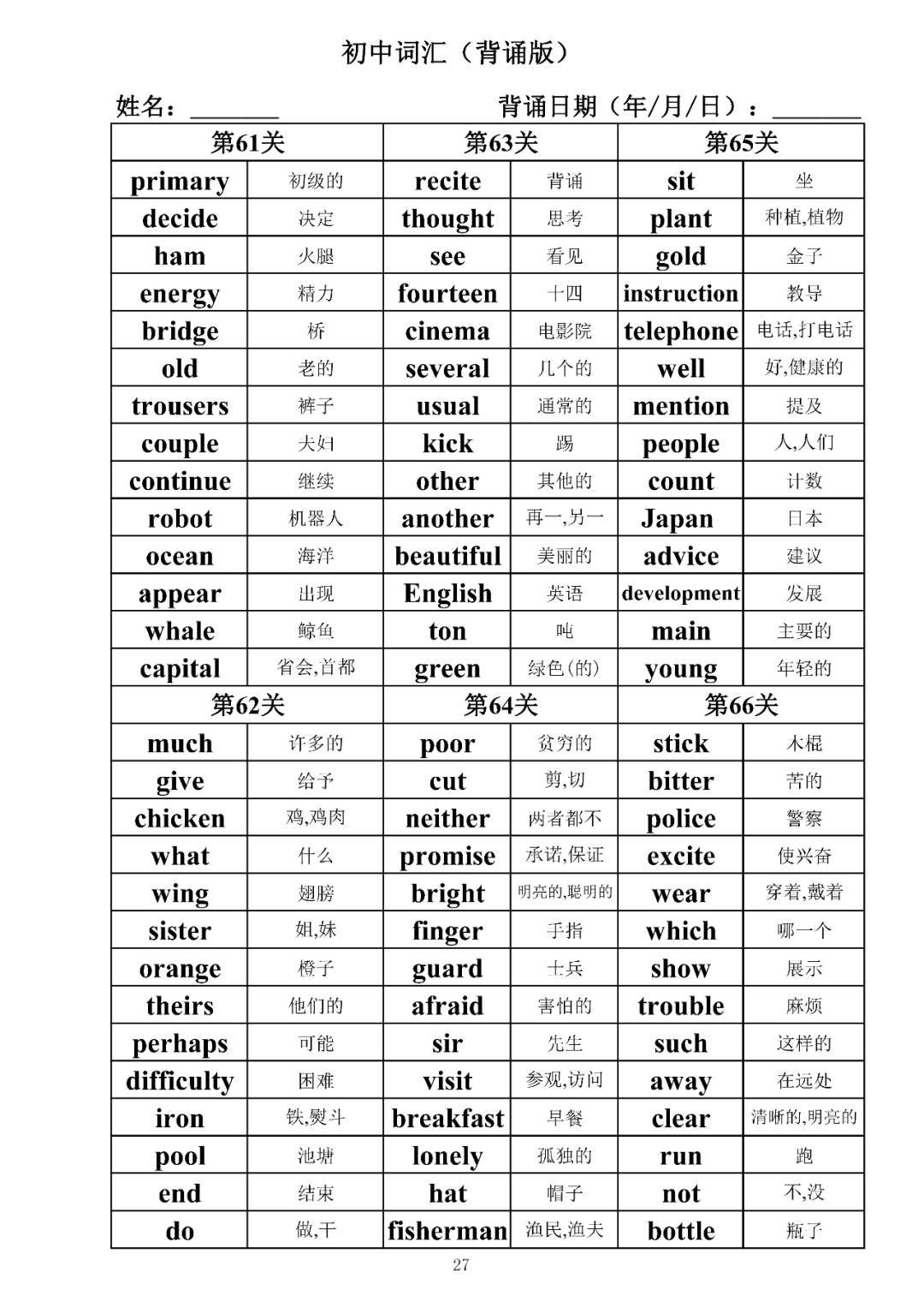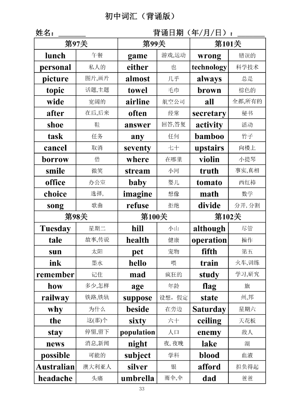 初中英语词汇(背诵版+检测默写版),打印出来直接用!