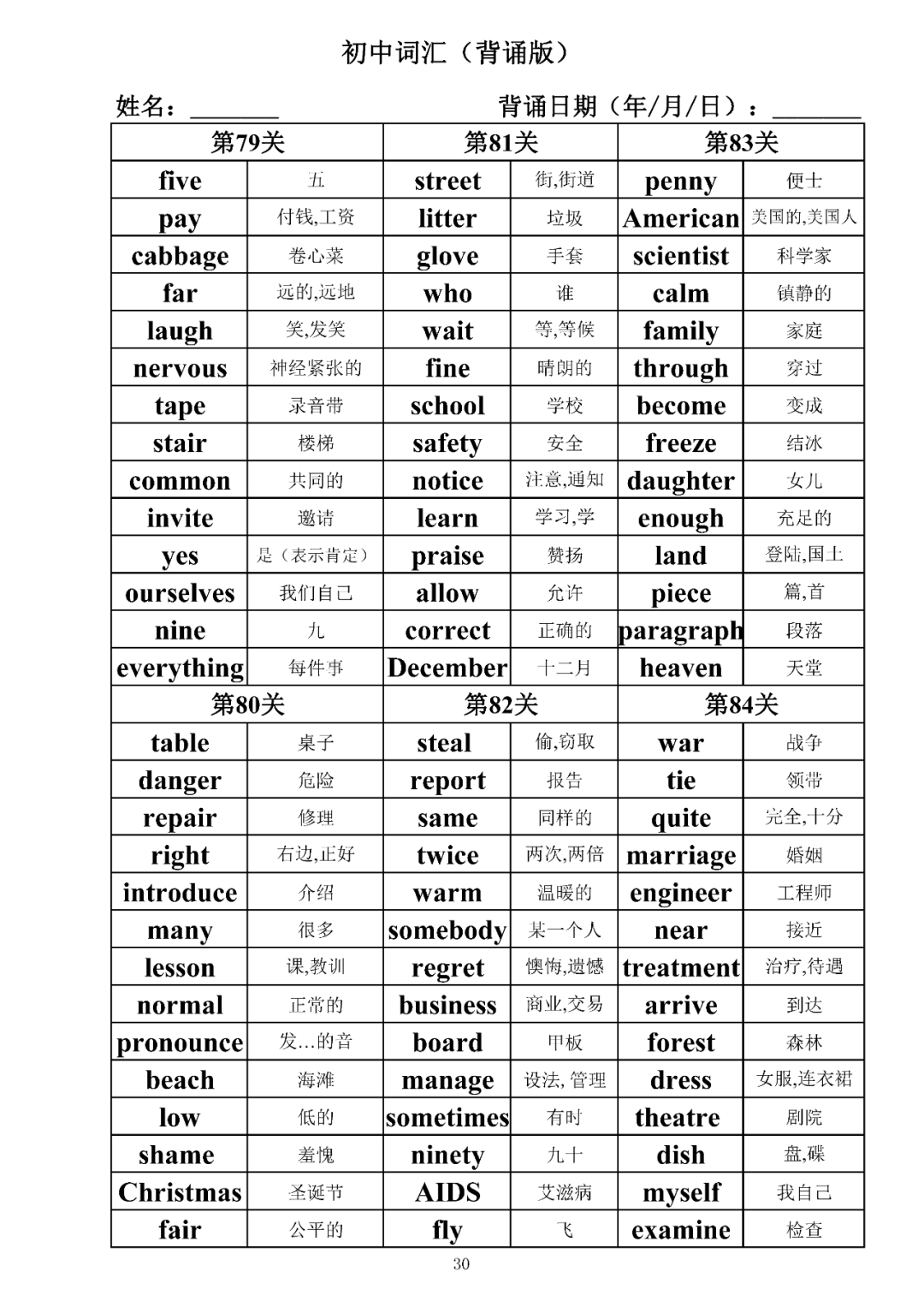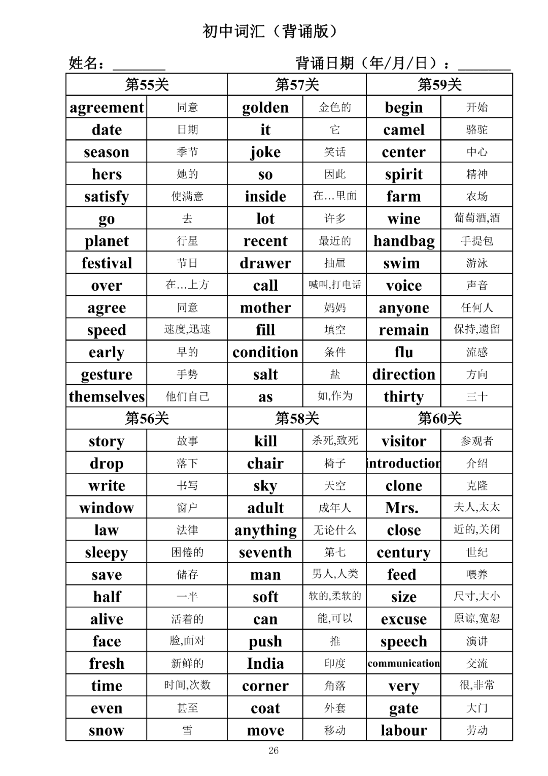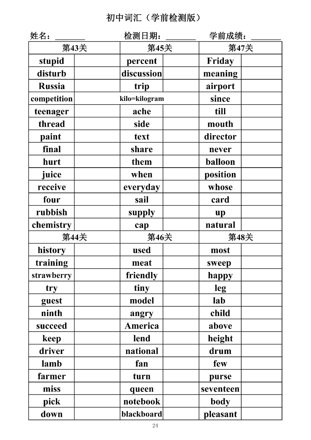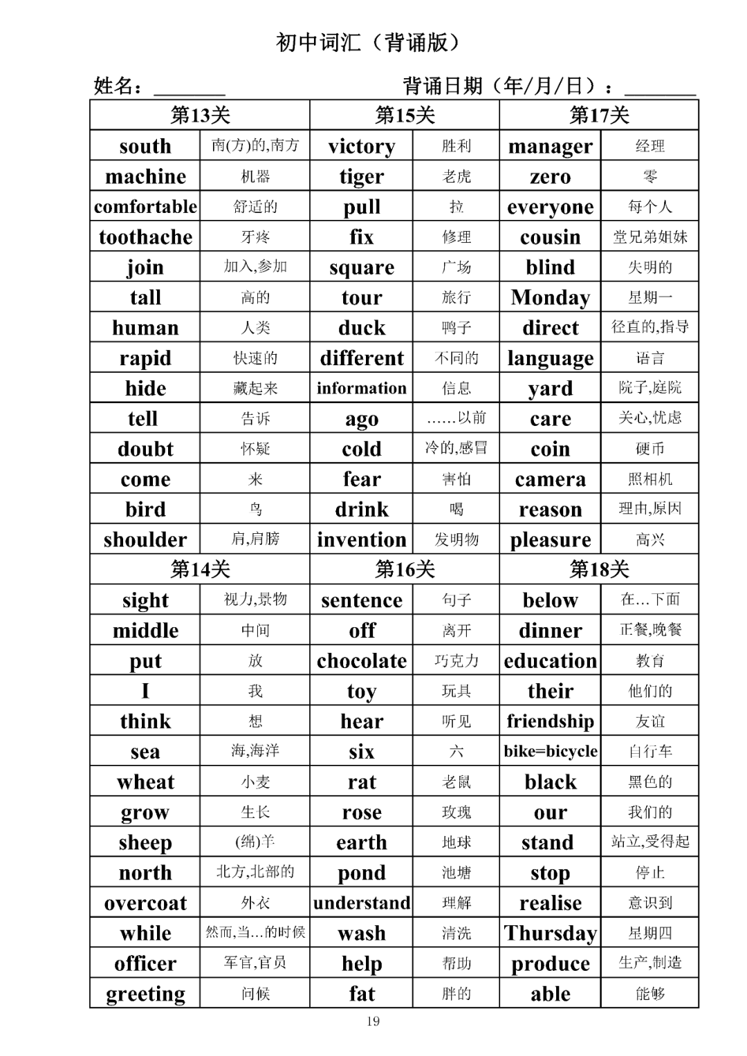 初中英语词汇(背诵版+检测默写版),打印出来直接用!