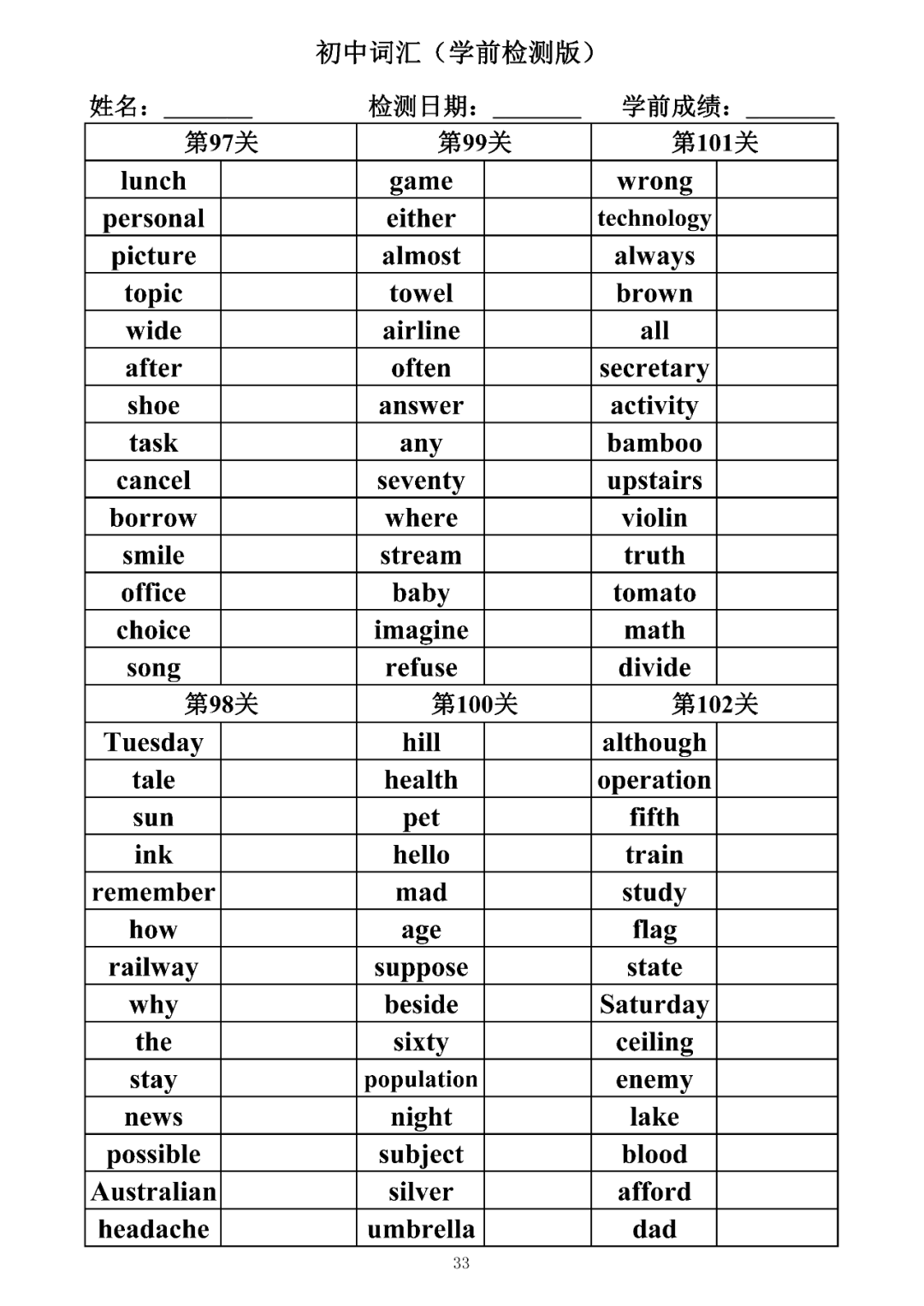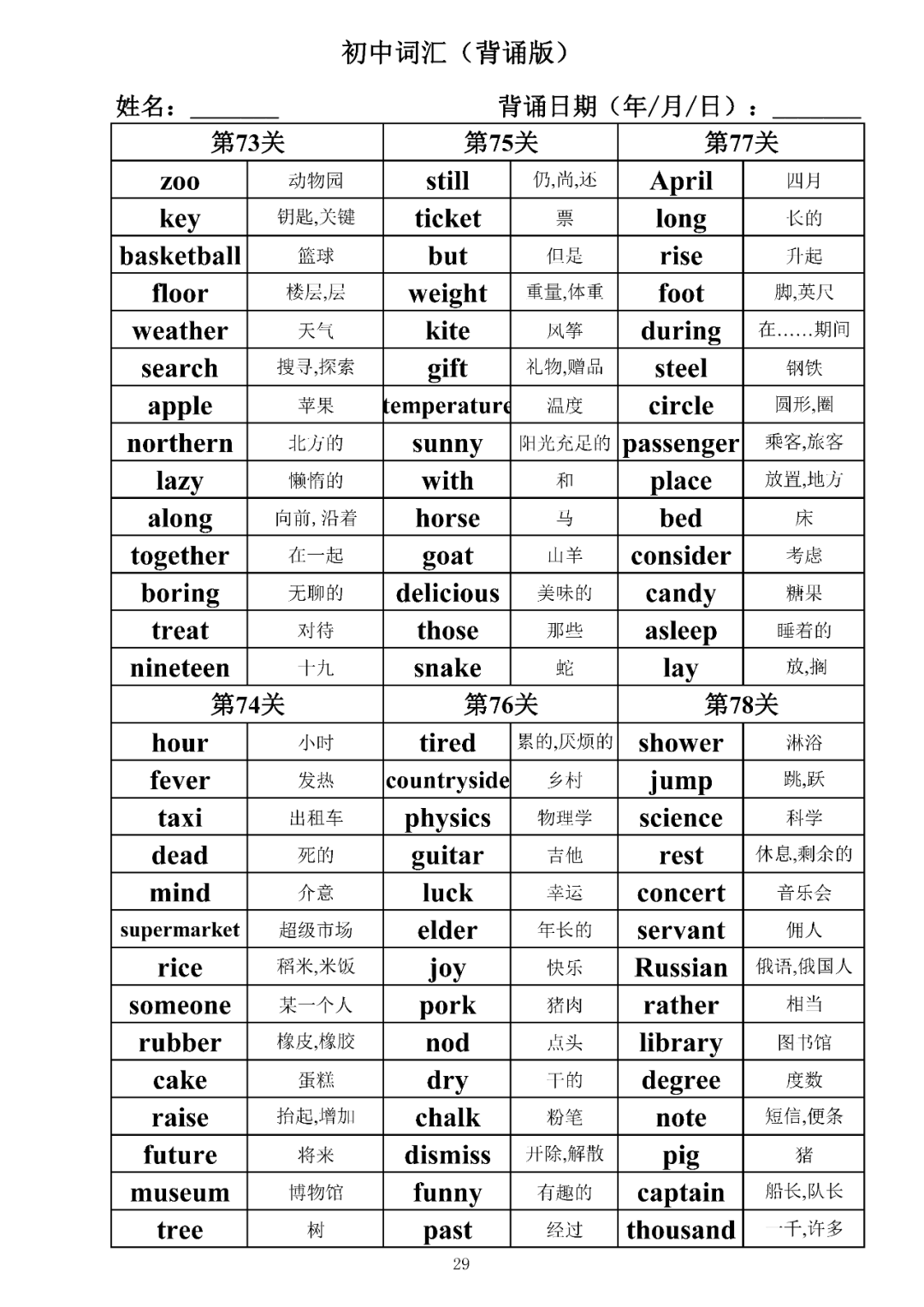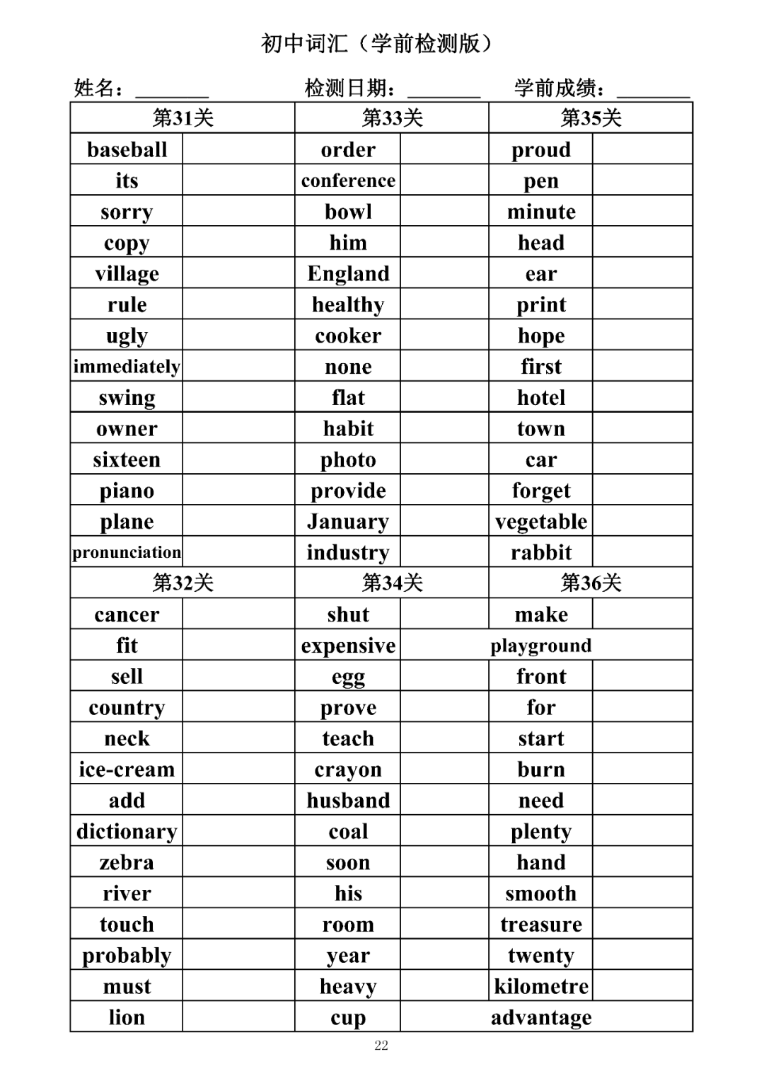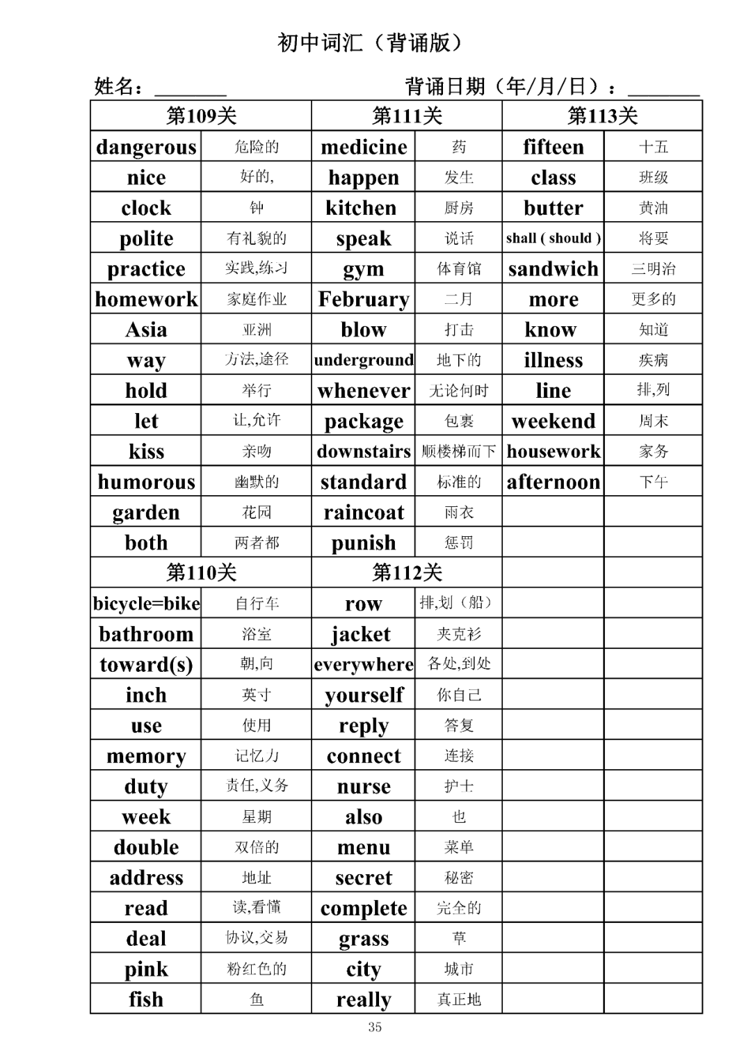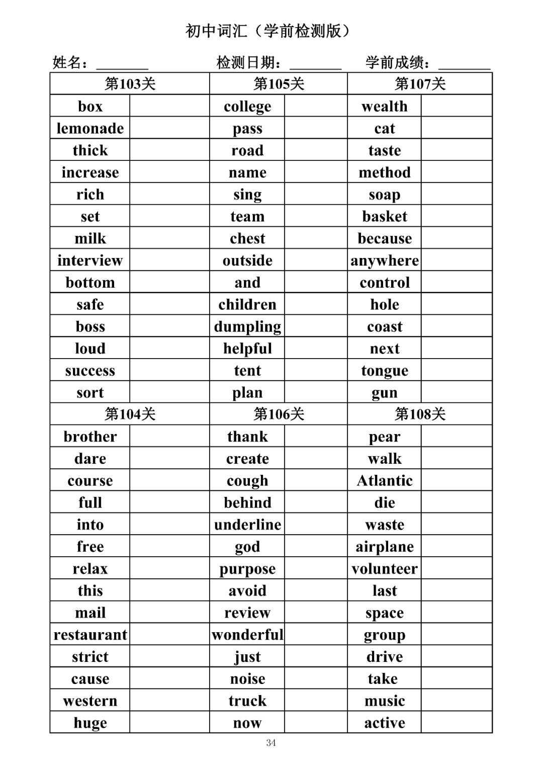 初中英语词汇(背诵版+检测默写版),打印出来直接用!