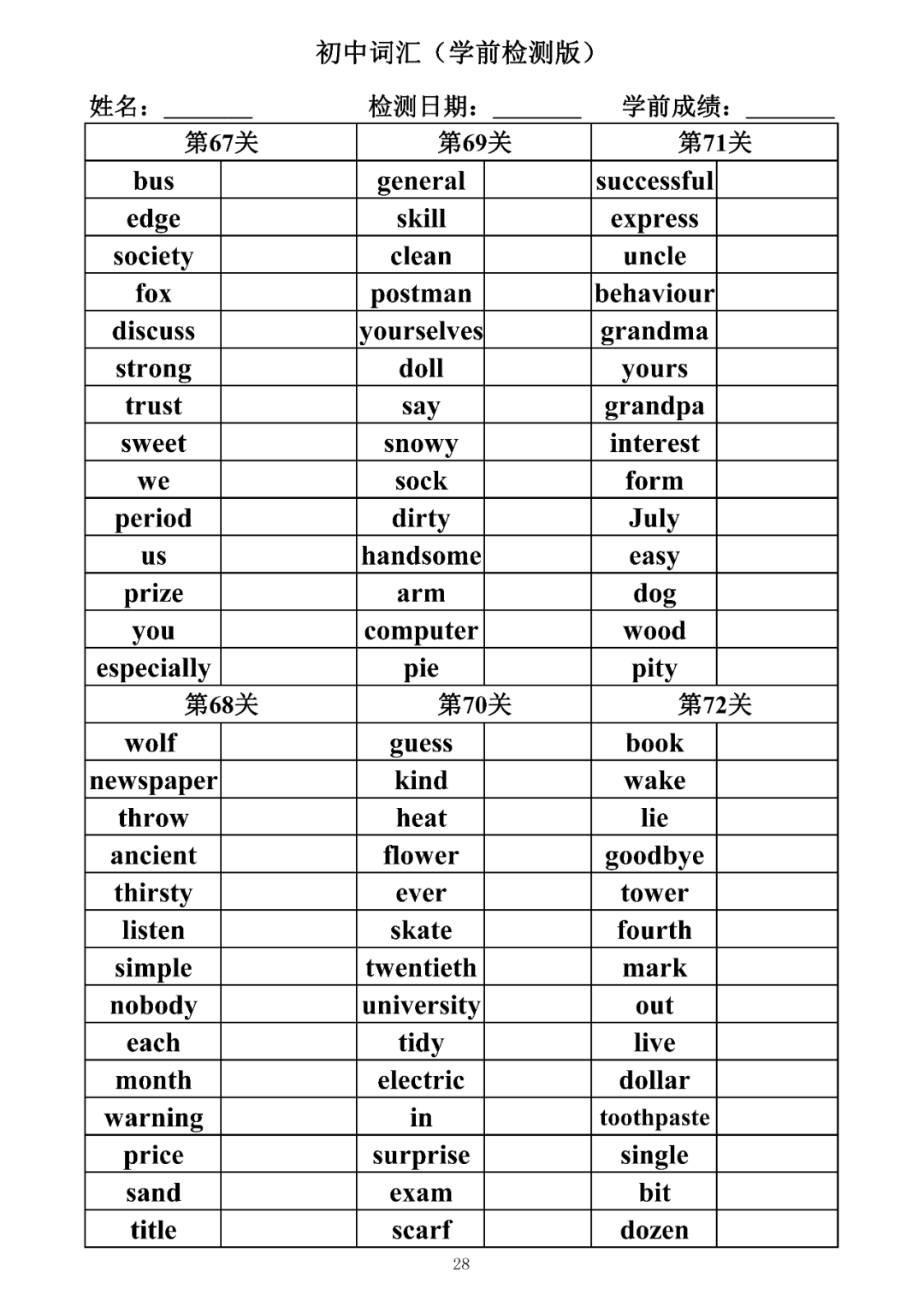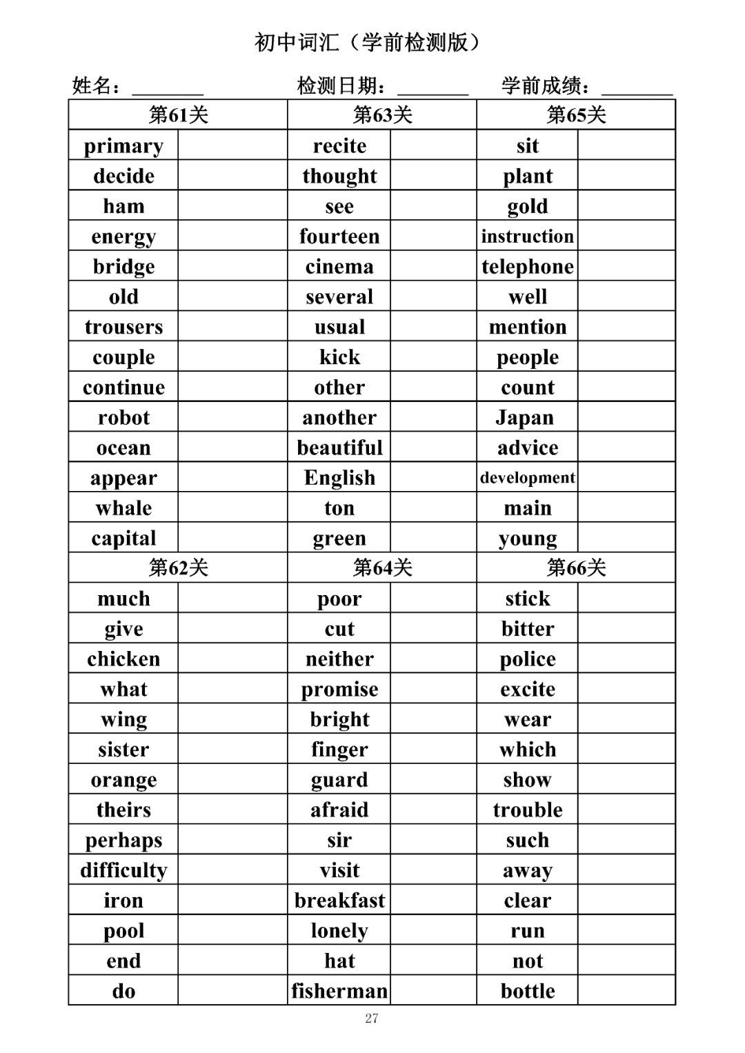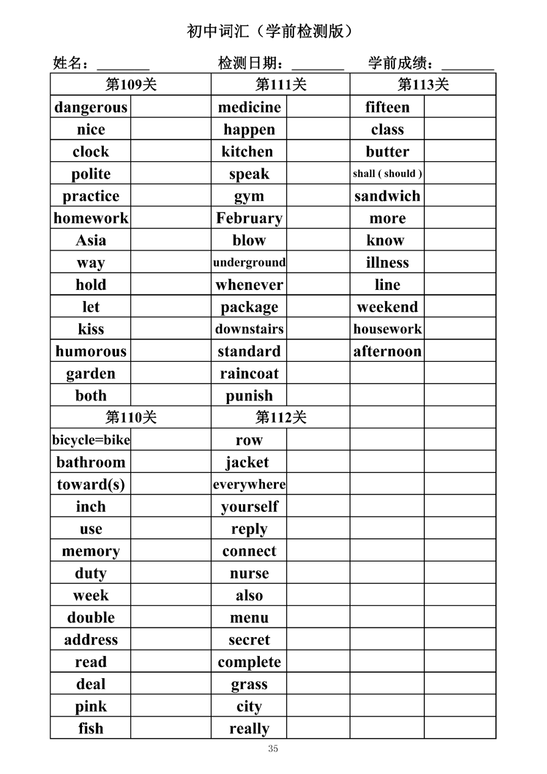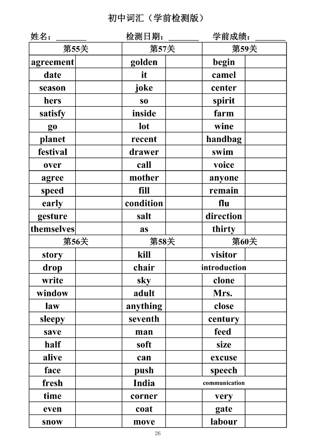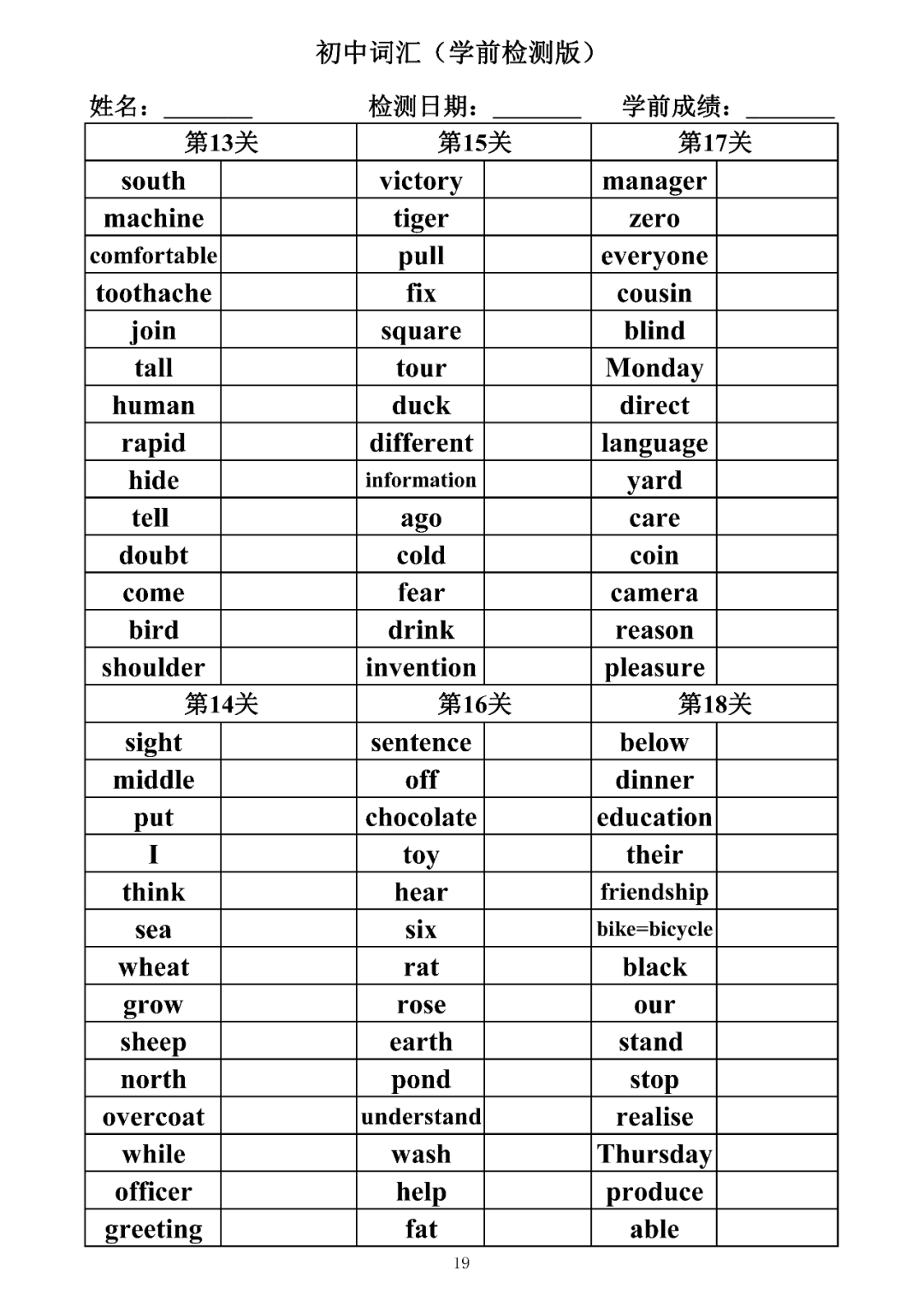 初中英语词汇(背诵版+检测默写版),打印出来直接用!