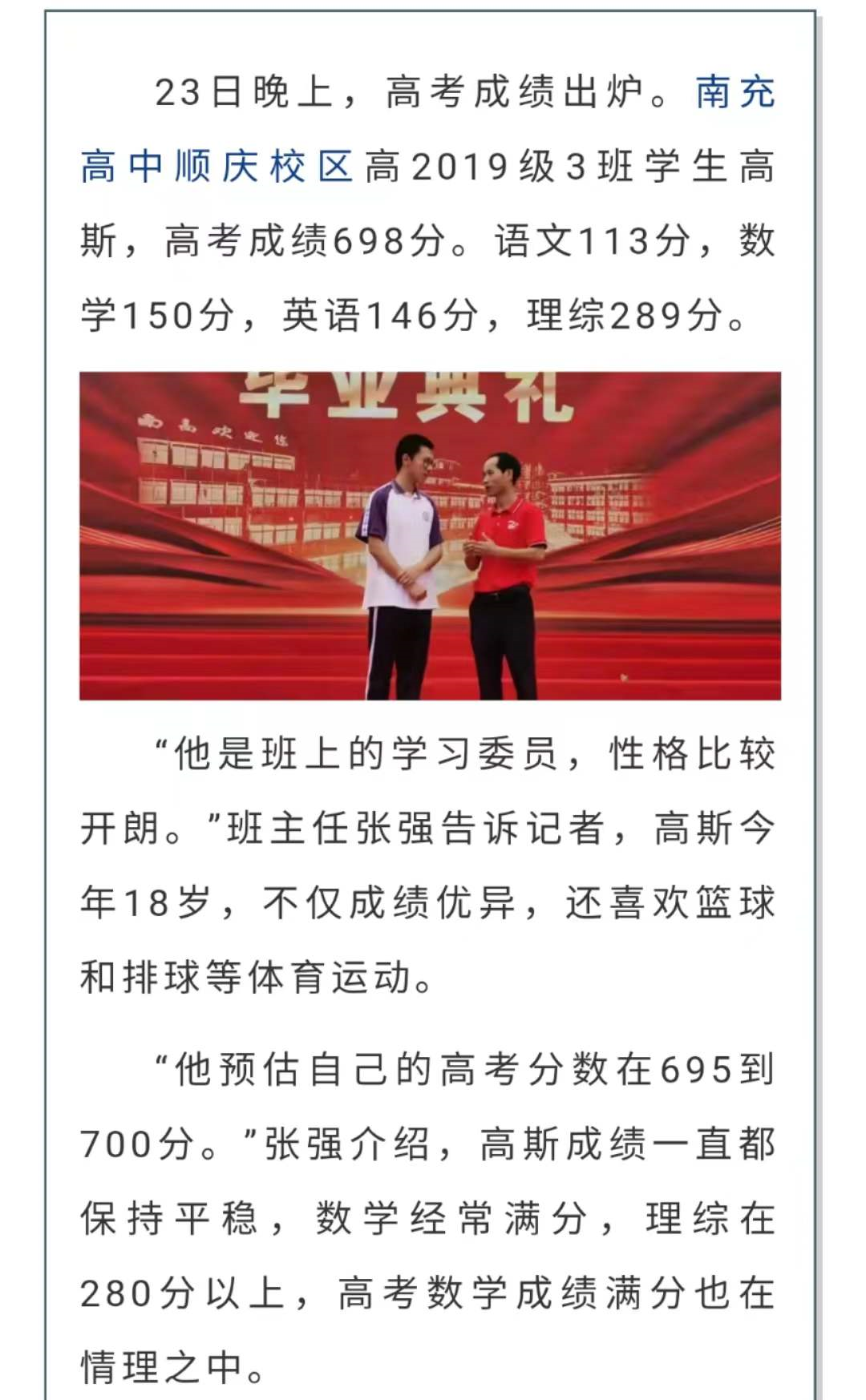 南充高中顺庆校区3班学生高斯2022年高考总分698分,其中语文113分,数学150分,英语146分,理科综合289分。这名考生理科非常厉害,语文113分就非常低了,距离语文考140分的考生相差27分。