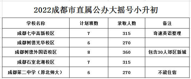 2022成都小升初大摇号学校,成都七中高新校区计划7个班,录取315人;树德光华校区计划6个班,录取270人;树德外国语校区计划8个班,录取360人;石室北湖校区计划7个班,录取315人;成都二中(原北师大成都附中,改为公办学校)计划6个班,录取270人。