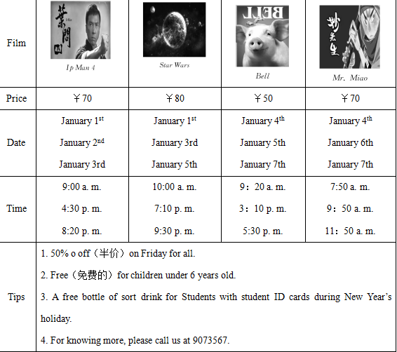 Good news! For the coming New Year, some films are at very good prices. You can watch them from Wednesday, January 1st to Tuesday, January 7th. These films are interesting. You can come here with your friends and your parents.