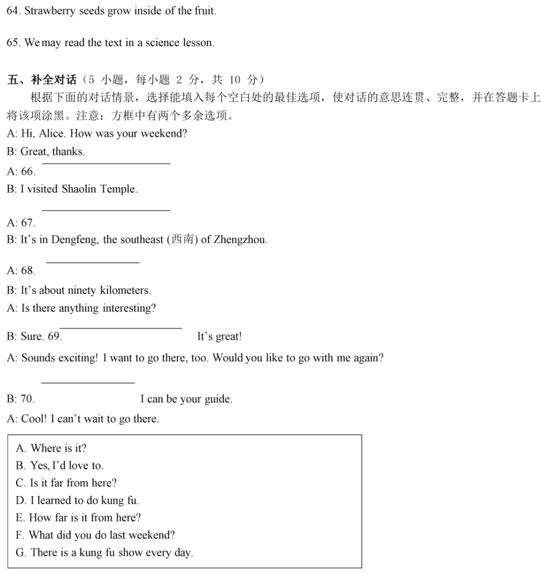 五、补全对话(5小题,每小题 2 分,共 10 分)