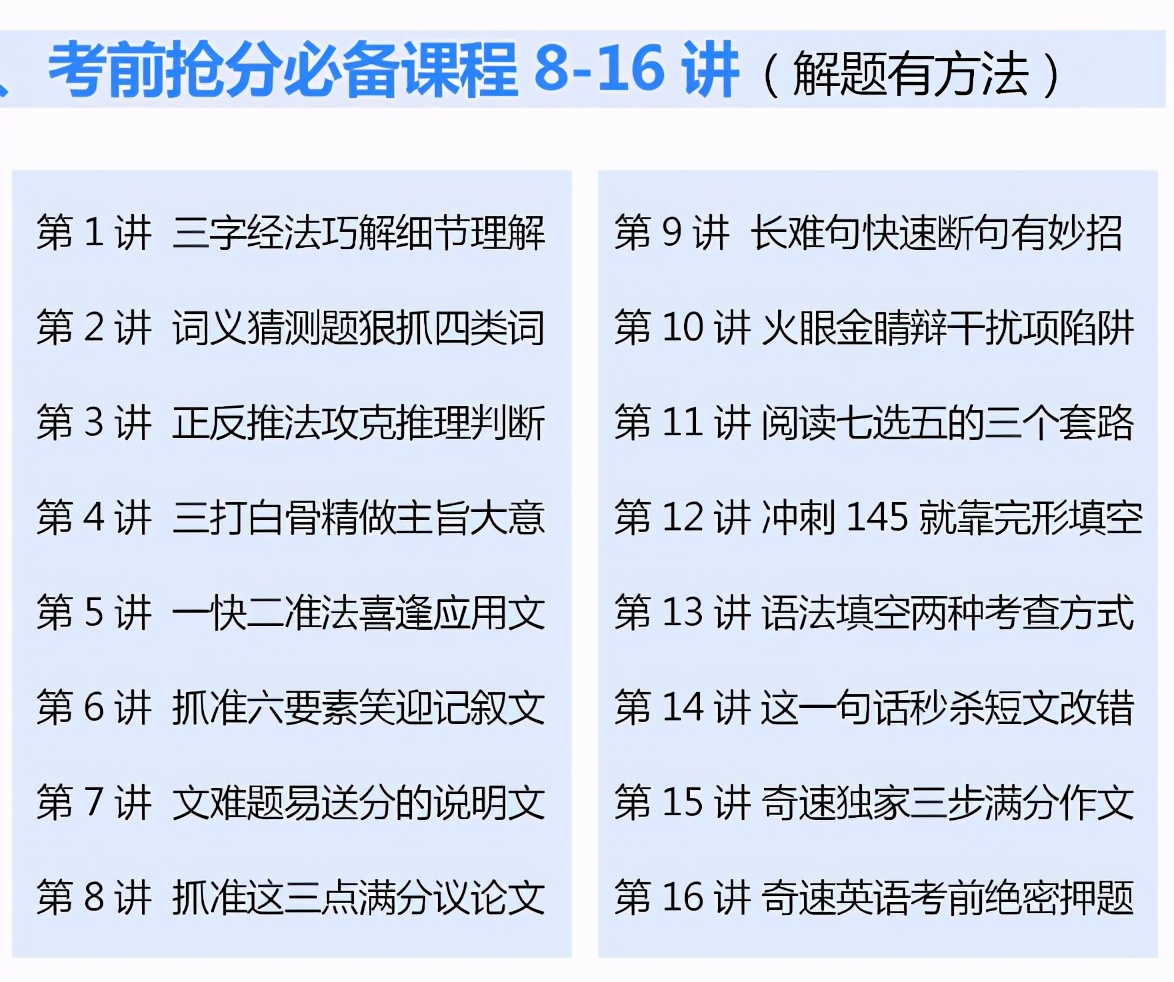 奇速英语高考冲刺16节课可以在线、双师或者面授课,手机、电脑、平板都可以学习,与名师实时互动,学习效率更高,知识吸收更快,同学们课堂在线提出问题,名师亲自解答,名师16讲通关学习。