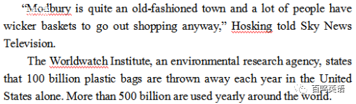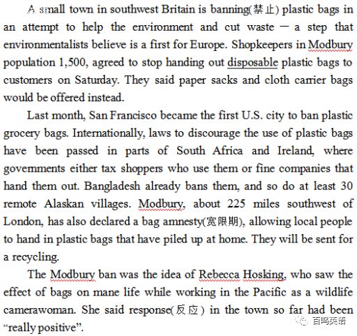 3. B A项与倒数第三段的“She said response(反应) in the town so far had been ‘really positive’”和倒数第二段“‘Modbury is quite an old-fashioned town and a lot of people have wicker baskets to go out shopping anyway, ’ Hosking told Sky News Television”相矛盾;C项与第二段首句‘Last month, San Francisco became the first U.S. city to ban plastic grocery bags’在范围上不一致;D项在原文里找不到证据,举的几个例子不能说明大多数国家立法禁止塑料袋,属于推理过度。故选B。