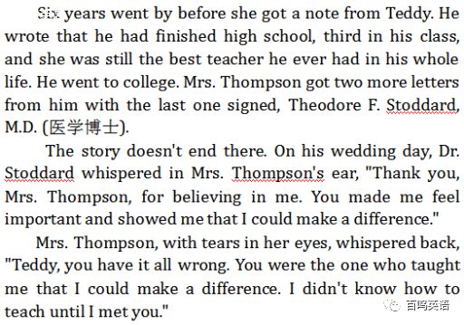 解析: 从文章第三段的“On that very day, she stopped teaching reading, writing and math. Instead, she began to teach children”可以看出,Mrs. Thompson不再是教授学生们文化课程,而是更加在思想上和孩子们沟通。A项就是字面意思,没有抓住Mrs. Thompson的内心思想的变化这个本质。