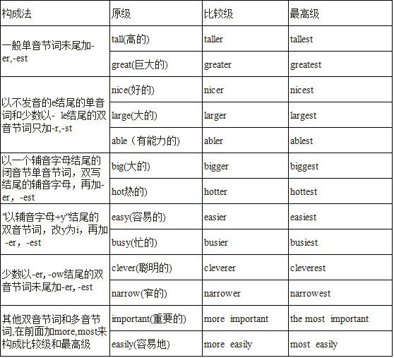 大多数形容词(性质形容词)和副词有比较级和最高级的变化,即原级、比较级和最高级,用来表示事物的等级差别。原级即形容词的原形,比较级和最高级有规则变化和不规则变化两种。