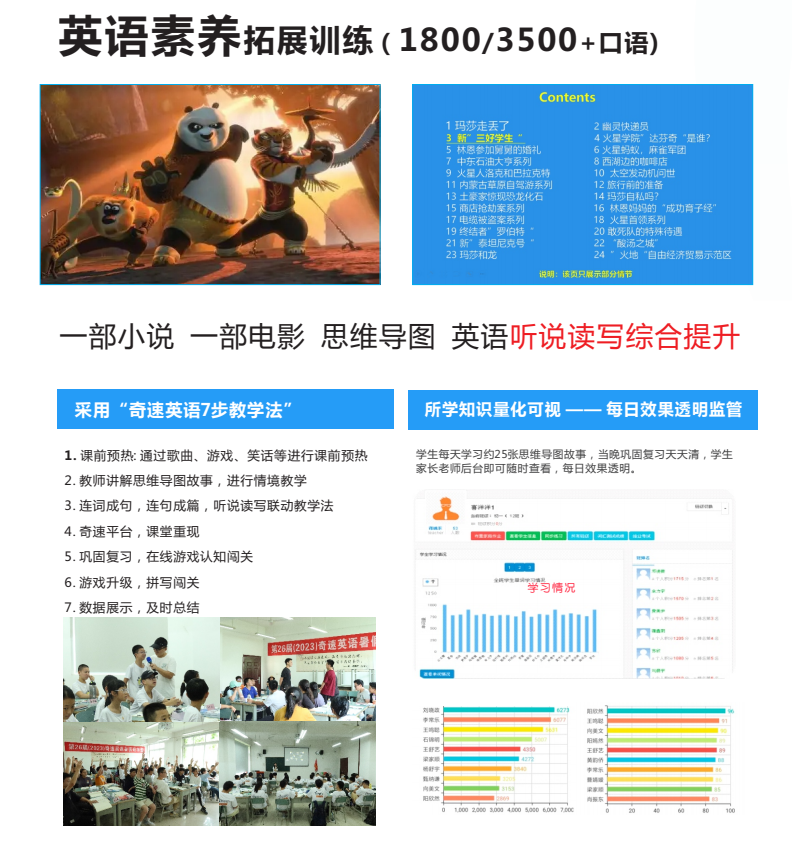 奇速英语特训营(寒暑假),已经成功举办了28届100期夏冬令营,并为全国20多个省市超过20000名学员提供了专业优质的学习服务。7天学习3年单词(成都营7天/香港营9天),听说读写全面快速提升。它化繁为简颠覆了传统记忆方法,通过一个中心词联想出音形义相关联10个单词,形成一张思维导图和一个英语小故事。200张思维导图快速记忆1800个词汇和奇速英语24个故事趣味串记3500个词汇,再通过独创的7311抗遗忘线上复训模式确保良好学习效果和口碑。这种方法不仅能够提高学习效率,更能锻炼孩子的发散思维和创新能力,在未来职场中更具领导才能。同时,奇速英语冬夏令营的课堂教学非常灵活多样,团队中学习、游戏中学习、竞争合作中学习等方式都被充分运用。奇速英语特训营已成为北上广深港澳川渝等全国20多省学生提升英语和培养发散思维创新能力的首选之一。