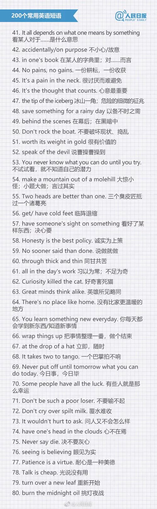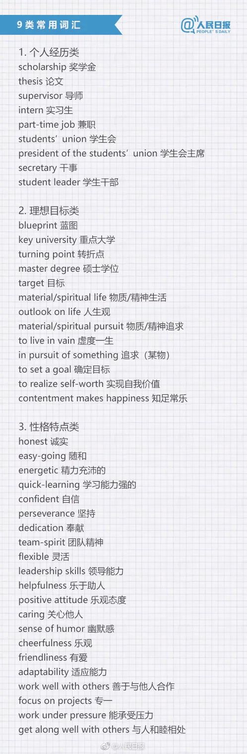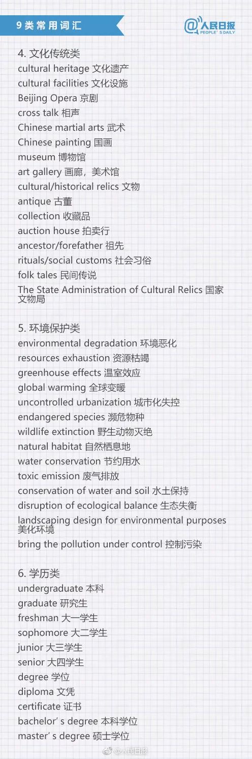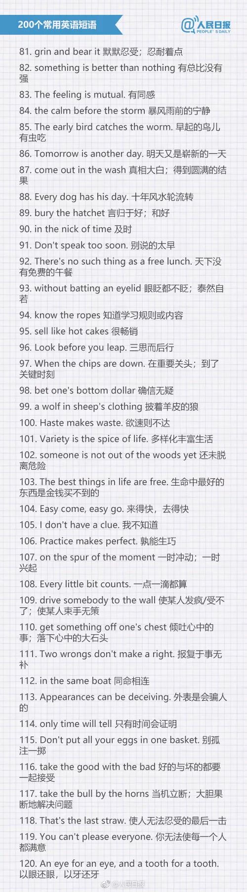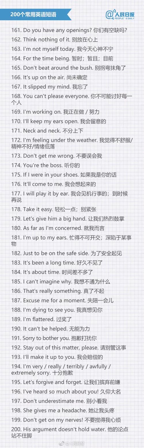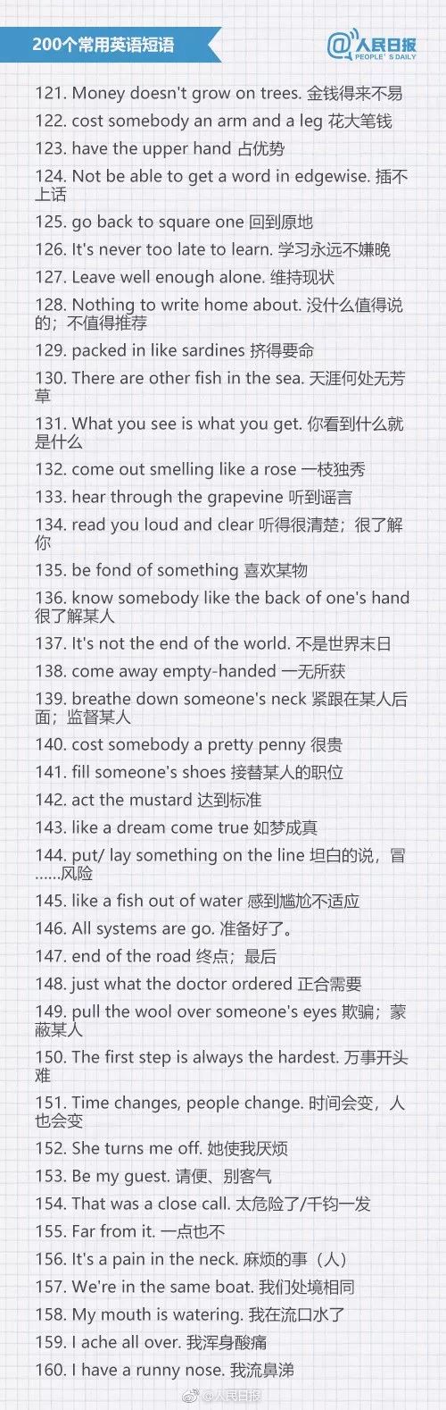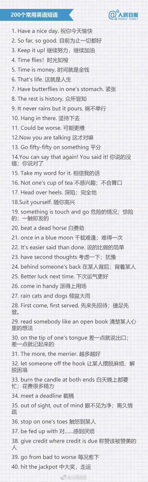 天小编和大家分享的是200个常用固定搭配和9大类词汇,学会可以运用到各个方面哦!(整理于:人民日报微博)
