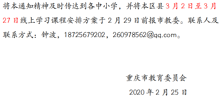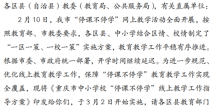 2月25日,重庆市教委发布了关于重庆继续延迟开学,要求各中小学做好线上教学工作的通知。会议指出,3月27日之前,学生都不会到校,将继续实行“停课不停学”方案。
