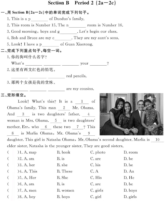 一、1.picture 2.next 3.girls 4.cousins 5.photo