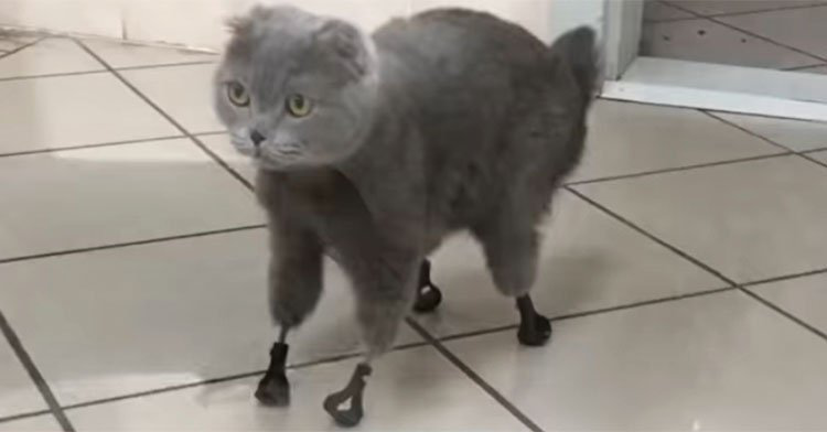 A kind human found Dymka on the side of a road in Novokuznetsk, Siberia. The poor cat had been out in the cold for so long that all four of her feet were destroyed and needed to be cut off. Instead of euthanizing(使安乐死) the animal, a team of veterinarians and researchers from Tomsk Polytechnic University decided to try out some new technology to get Dymka moving again.