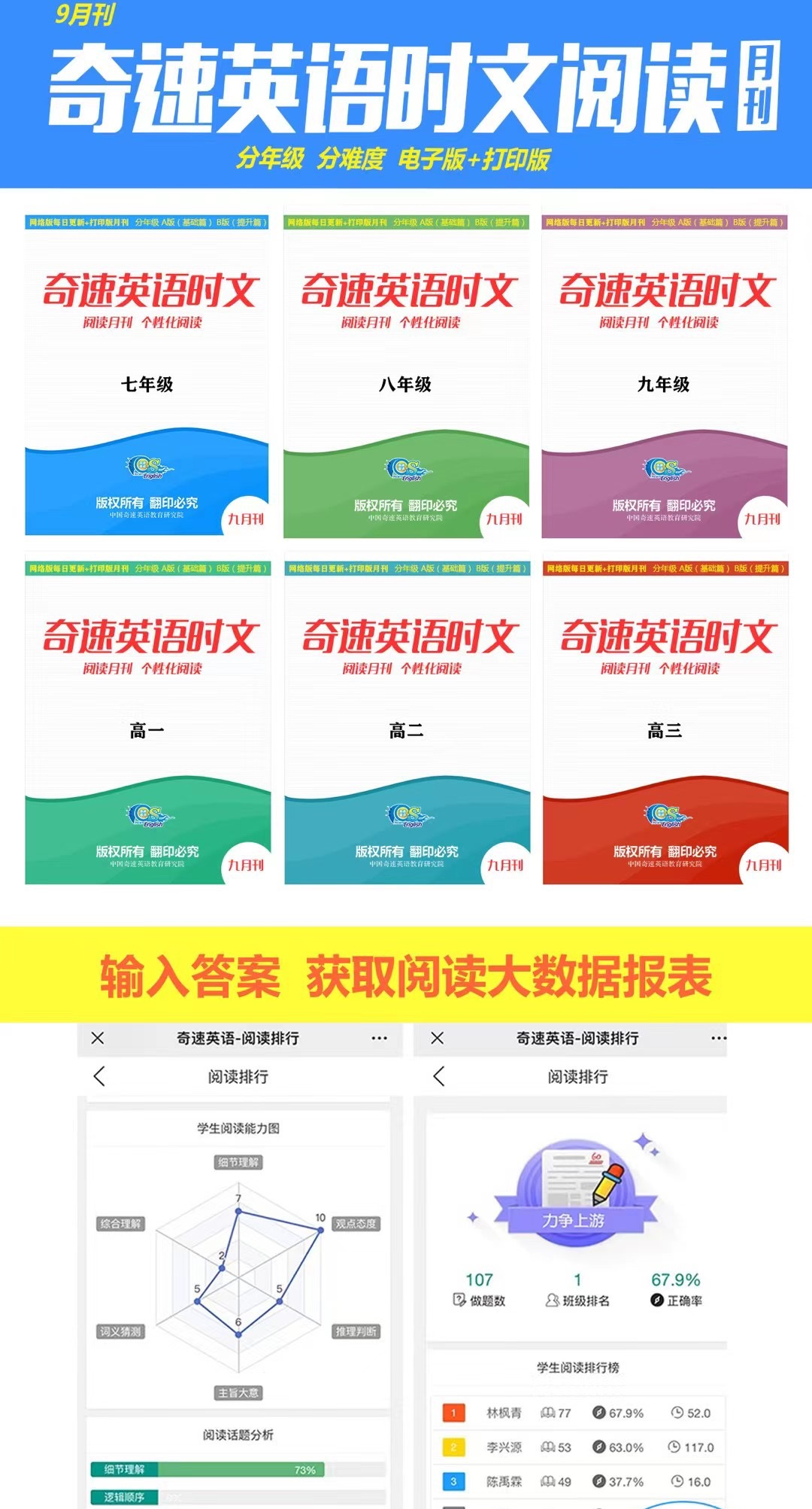 由于篇幅有限,完整版参考《奇速英语时文月刊》各年级打印版从9月刊开始,购买网络版送打印版,与每日更新的网络版保持同步,新增了重难词汇、长难句及大数据精准测评报告!