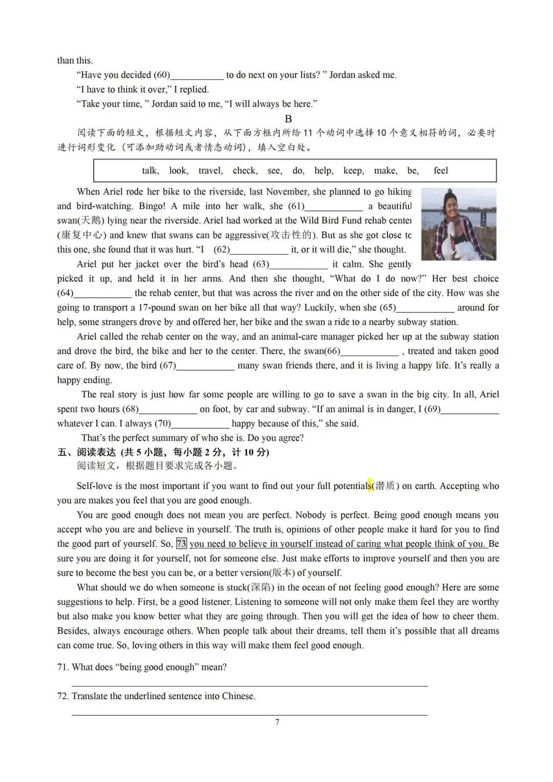 (一)答案 71.It means you accept who you are and believe in yourself./Accepting who you are and believing in yourself.