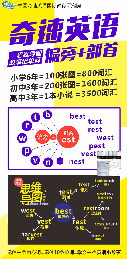 中学英语教育专家、硕士生导师、连续三年CCTV全国中小学生英语电视大赛评委团副主席、教育界杂志执行主编,奇速英语创始人——蔡章兵教授说:英语成绩不好的学生,100%都是差在单词和阅读上。不管是基础生、偏科生、拔高生、艺考生,几乎90%的学生都都是一个一个孤立的去记忆,杂乱无章,很容易忘记,导致升学考试,中高考英语成绩都在及格线下徘徊, 甚至有45%的孩子因为厌恶英语而弃学。除了奇速英语夏令营思维导图故事记单词课程,奇速英语漏斗速记单词法软件,漏掉认识词,专攻陌生词,中考1600词汇高考3500认知词汇(不必拼写),目的是用于解决阅读理解词汇认识即可;但每人必须过核心拼写词汇,用于书面表达。