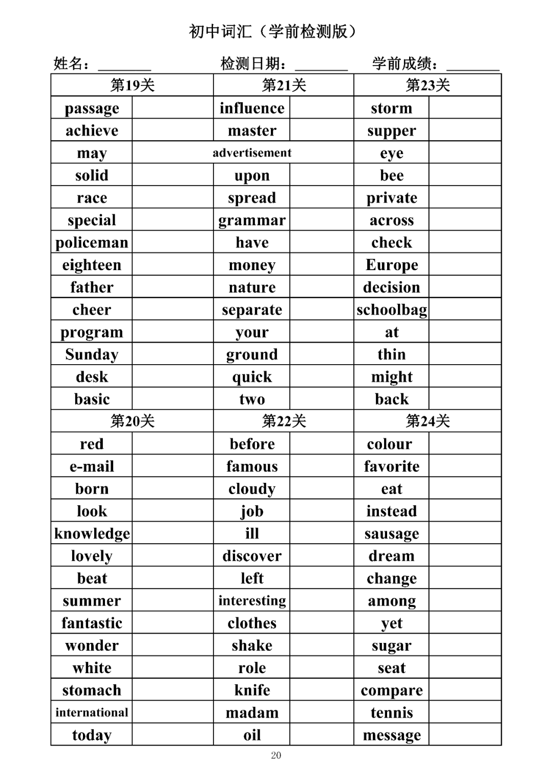 词汇是语言的基本材料,是语言的三大要素之一,掌握好词汇是学好英语的重要基石。离开词汇,语言就失去了实际意义。由此可见,词汇教学在语言教学中占有重要的地位。今天老师为同学们整理了初中词汇背诵版+检测版+音频,需要的同学收藏起来学习。老师已为大家备好电子打印版,文末附电子打印版付费领取方式,想要获取电子打印版请拉到文末。